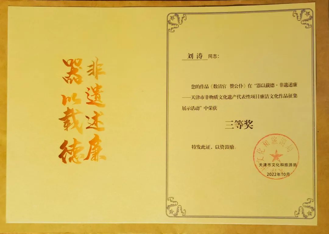 学院教师刘涛(艺名:刘明涛),相声演员,天津市级非物质文化遗产“太平歌词”项目区级代表性传承人。2022年9月上旬,刘涛在接到市相关部门“器以载德·非遗述廉——天津市非物质文化遗产项目廉洁文化作品征集展示活动”通知后,积极响应,查阅历史资料,利用业余时间进行采风,搜集整理京、评、梆、粤以及鼓曲等历史故事,独立创作完成了非遗“太平歌词”项目原创作品《数清官 赞公仆》,并录制了音频作品,在作品展示活动中被评为三等奖。