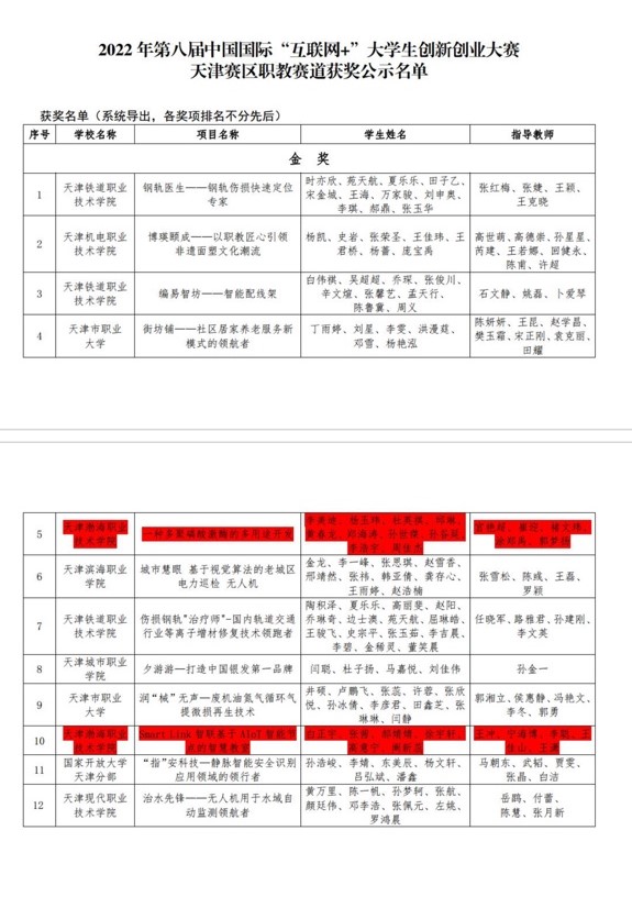 近日,第八届中国国际“互联网+”大学生创新创业大赛天津赛区职教赛道决赛成绩公布,学院选送的环境与化工学院、信息工程学院参赛队从全市60个代表队中脱颖而出,荣获该赛项天津赛区金奖,刷新历史最好成绩。