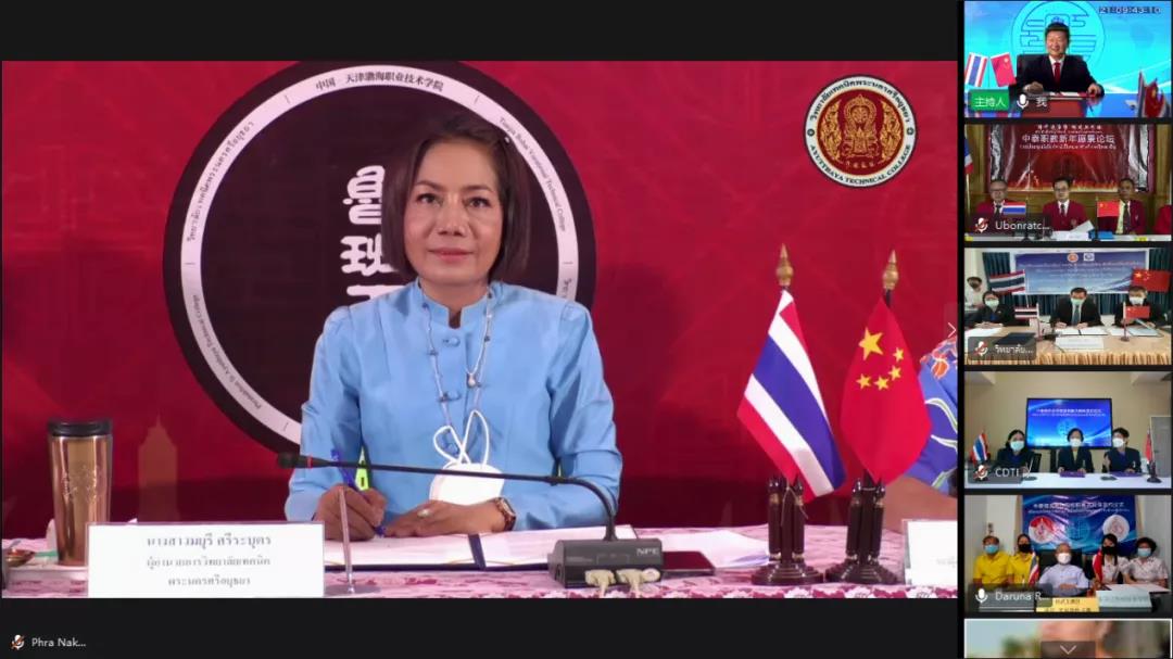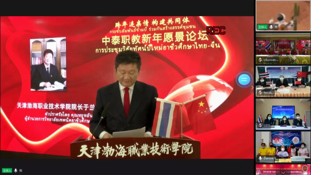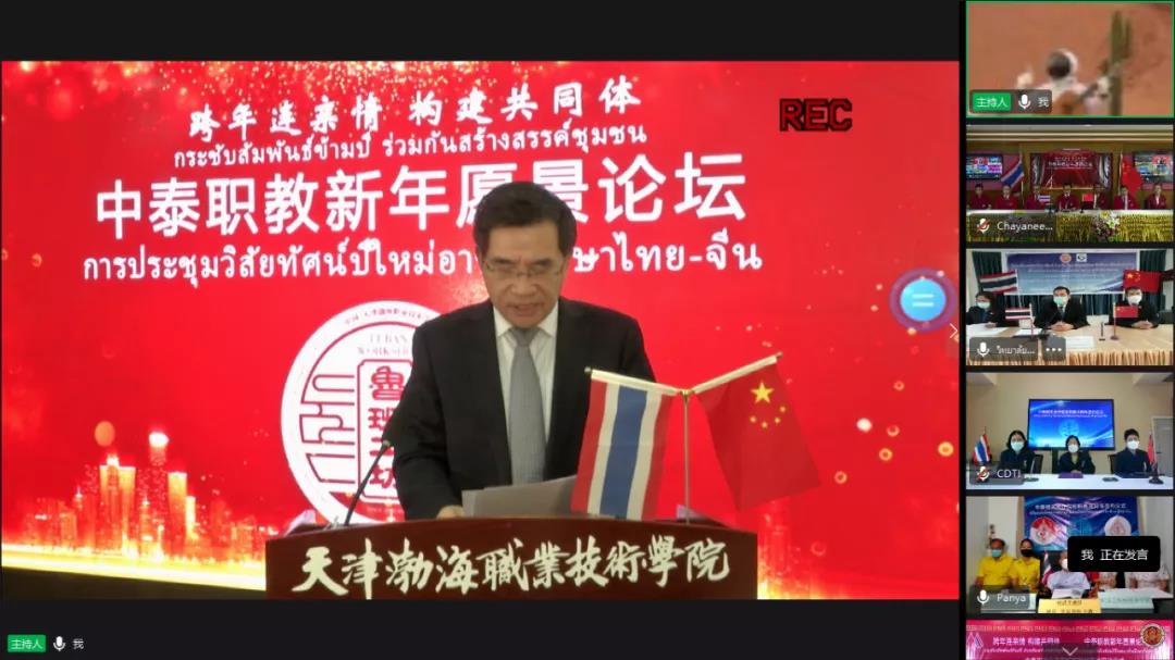 “跨年连亲情 构建共同体”中泰职教新年愿景论坛于2021年12月17日上午在天津渤海职业技术学院云平台隆重举行,泰国六所学院在五个分会场参加了此次论坛。泰国大城技术学院院长玛悠丽,吉拉达技术学院院长苏梦塔夫人和暖阿侬校长,甘塔拉拉克技术学院院长维罗德,乌汶理工学院院长尼兰,达鲁纳职业学院和达鲁纳技术学院领导班亚,天津铁道职业技术学院党委书记、院长于忠武,天津渤海职业技术学院党委书记王义龙,天津渤海职业技术学院党委副书记、院长于兰平等出席,天津渤海职业技术学院副院长申奕主持。