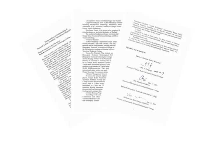 泰国鲁班工坊国际专业合作备忘录签约仪式泰国吉拉达技术学院、甘塔拉拉克技术学院、乌汶理工学院、达鲁纳职业学院、达鲁纳技术学院领和泰国鲁班工坊的代表大城技术学院和天津渤海职业技术学院签署了泰国鲁班工坊国际专业合作备忘录,达成深入合作意愿。