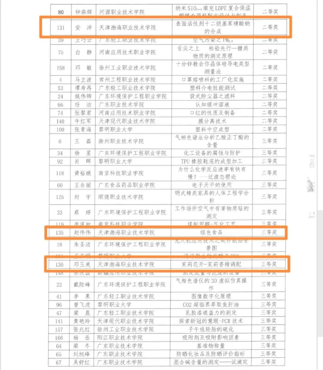 此次获奖作品全部来自环境与化工学院,其中于欣的《嗅觉感知气味的奥秘》荣获一等奖;曹晓霞的《中国饮食文化——食医》和安洋的《表面活性剂十二烷基苯磺酸钠的合成》两件作品荣获二等奖;赵伟伟的《绿色食品》、邓玉美的《茉莉花开——茉莉香精的调配》、冯晓翔的《环境污染对食品安全的影响》、曹卫忠的《精酿啤酒美式IPA品鉴和评分》、夏君的《水蒸气蒸馏法实例——薰衣草精油的制备》、郭梦扬的《口腔卫生用品——牙膏》、陈娜的《食品标签》共七项作品荣获三等奖。