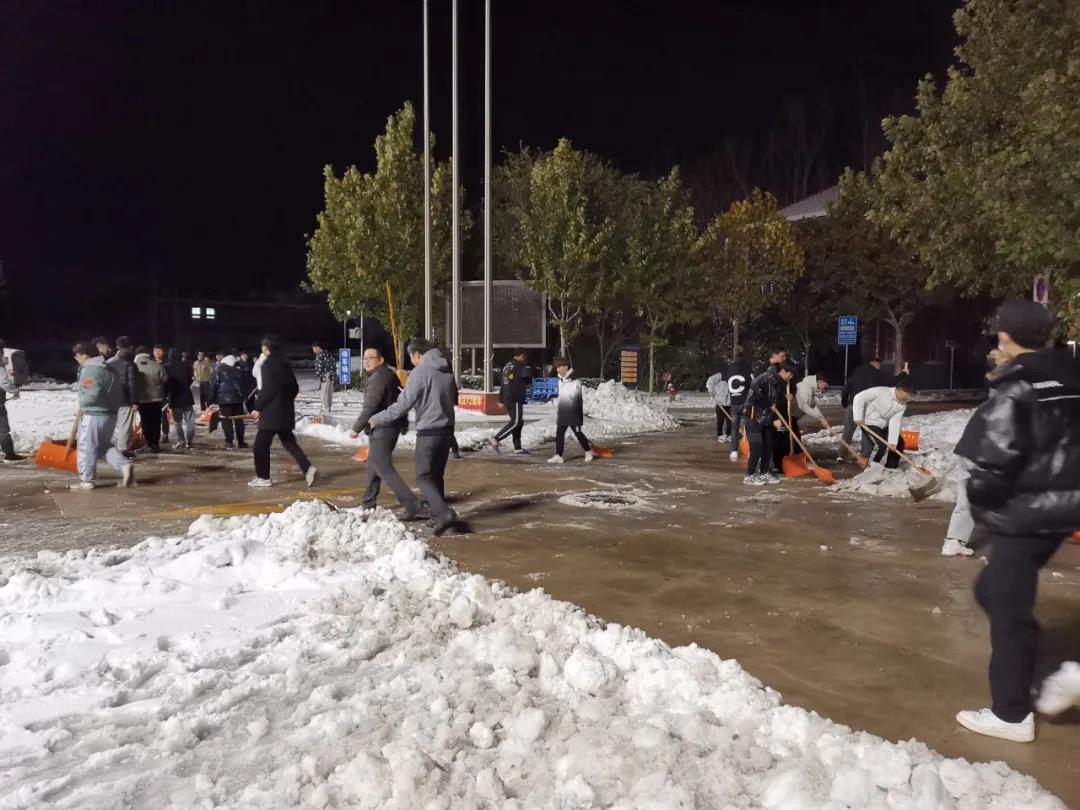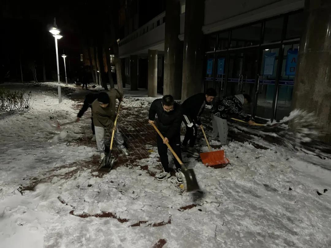 11月7日,天津市普降暴雪,降雪持续时间长、雪量大,校园内积雪情况时刻牵动着全体党政领导的心。为确保暴雪过后学院道路通畅和行车安全,保障师生的工作、生活和学习秩序,后勤处本着“雪情就是命令、雪情就是责任”的原则,迅速启动冬季冰雪应急预案,从早晨六点开始集中工作人员对校园主干道、教学楼和食堂附近道路的积雪集中进行清理,一直到下午七点半,从机械到人工进行了“车轮战”。保卫处也冒雪组织保安人员在学校门口进行融雪、清雪。晚上七点,在副院长花玉香的带领下,信息工程学院党支部书记张楠、党支部副书记王佳山组织本院200多名学生干部继续对主干道及学生宿舍和教学楼等学生必经之路的积雪进行全面清理,劳动持续了两个半小时。