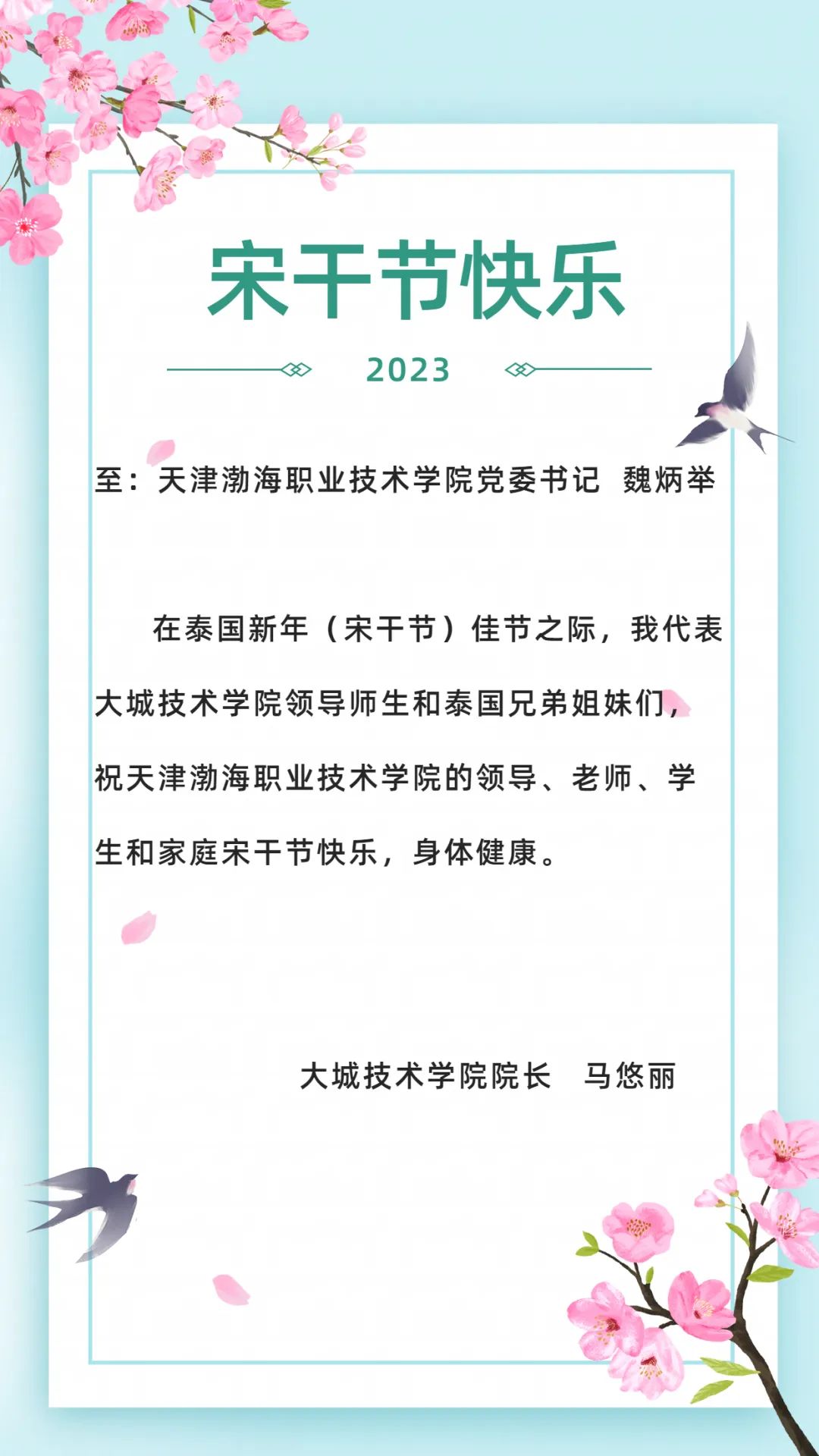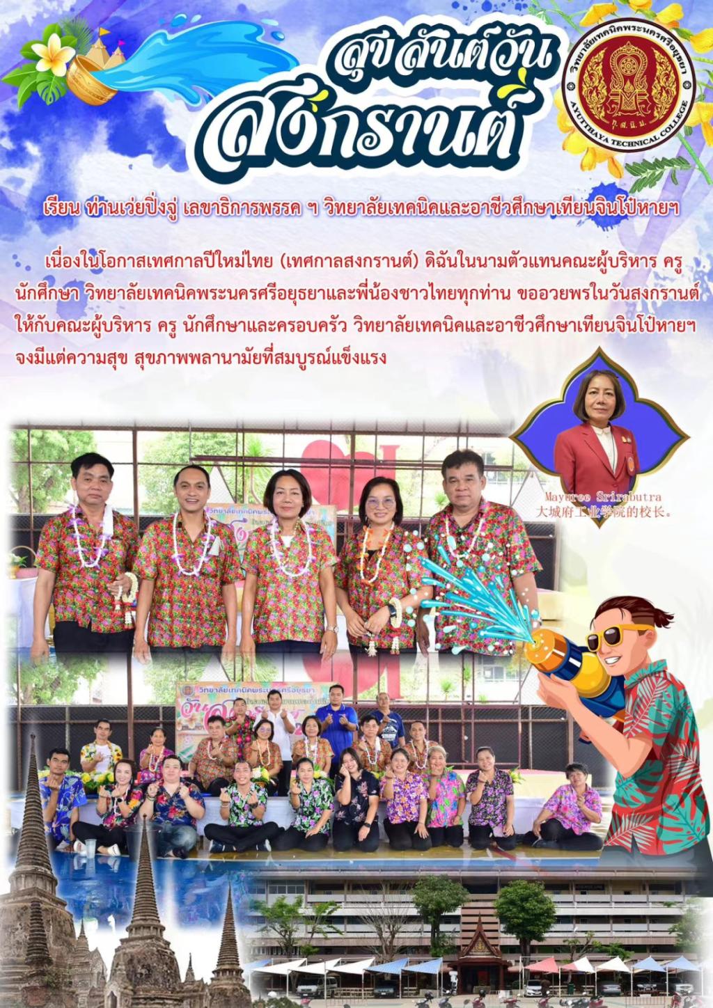 值此佳节之际,学院党委书记魏炳举,党委副书记、院长花玉香通过录制视频的方式向泰国的师生送去了最诚挚的节日祝福。