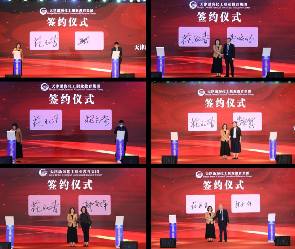 在签约和授牌仪式上,职教集团与天津渤化化工发展有限公司等本市、外埠9家企业签署了校企合作协议,为天津大沽化工股份有限公司等3家“双栖教师培训基地暨应用技术技能人才实训基地”授牌,为天津市经济开发区人力资源和社会保障局、绍兴市上虞区人力资源和社会保障局等5家“人才服务工作站”授牌。职教集团下属7家一线教学单位分别为中国石化润滑油有限公司润滑脂分公司、顺丰速运(集团)有限公司等7家“人才培养基地”授牌。