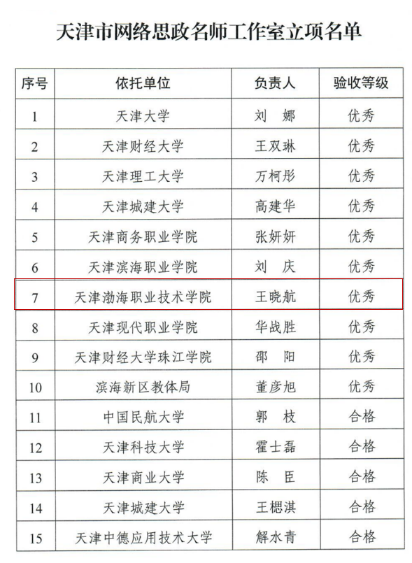 日前,市教育两委下发《关于推进天津市网络思政名师工作室培育建设的通知》,经过严格考核验收,学院网络思政工作室获批成为首批天津市网络思政名师工作室,考核等级为优秀,位列天津市首批网络名师工作室项目前十。