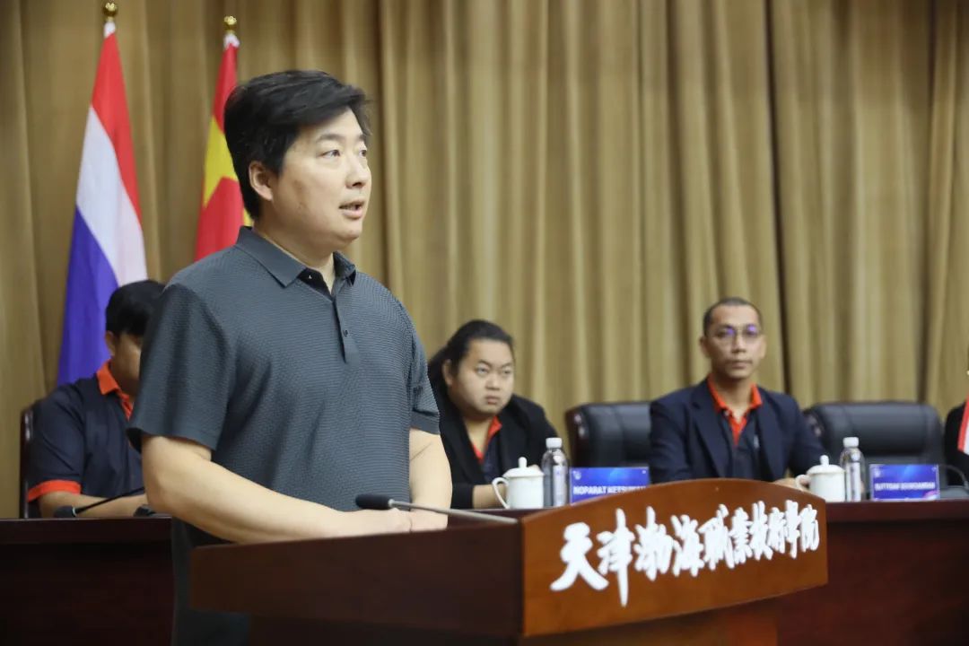 信息工程学院副院长蔡杰作为中方教师代表发言,他首先欢迎各位同学加入渤海大家庭,并希望大家能续写泰国鲁班工坊的辉煌,做到:胸怀天下,为创造美好世界做出贡献;刻苦学习,为服务祖国建设发展做好准备;广交朋友,为促进中泰友谊搭建桥梁。
