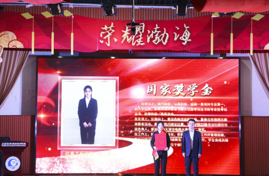 与会全体领导分别为2022—2023学年度天津市人民政府奖学金、国家奖学金、天津市优秀学生、天津市优秀学生干部、第九届中国国际“互联网+”大学生创新创业大赛国赛代表队、天津市创新创业奖学金、国家励志奖学金、天津市先进学生集体、校级优秀班集体、校级优秀学生和优秀学生干部等各级各类荣誉获得者和先进集体进行了颁奖。