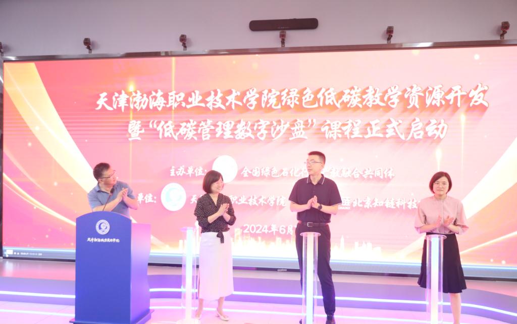 为深入学习贯彻习近平生态文明思想,践行全国绿色石化行业产教融合共同体“绿色、低碳、创新”的理念,6月12日,天津渤海职业技术学院在虚拟仿真实训基地举行了绿色低碳教学资源开发——暨“低碳管理数字沙盘”课程启动仪式。此次活动为学院绿色低碳智慧生态馆开馆活动的同期活动,由全国绿色石化行业产教融合共同体主办,天津渤海职业技术学院和北京知链科技公司承办。天津渤海化工集团有限责任公司人力资源部部长刘洋,学院党委副书记、院长花玉香,北京知链科技公司北方总监蒋晓燕,天津排放权交易所交易业务部业务经理李翠红参加了启动仪式。仪式由学院副院长吴国旭主持,学院各部门、二级学院领导与师生代表参加。