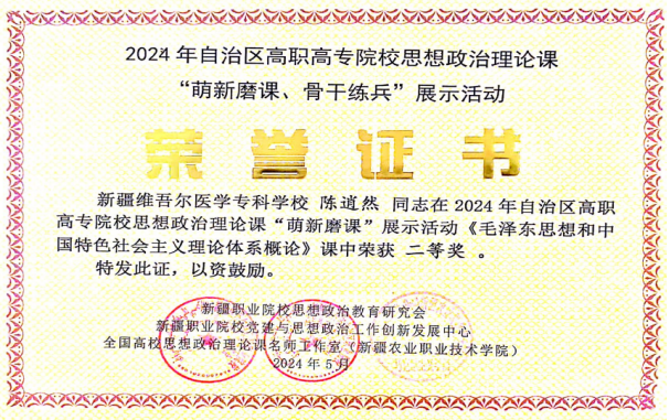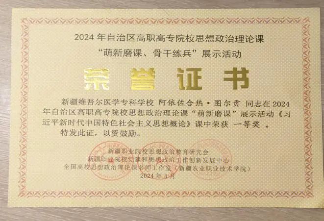 图4:新疆维吾尔医学专科学校马克思主义学院教师在2024年自治区高职高专院校思想政治理论课“萌新磨课、骨干练兵”教学展示比赛中的获奖证书