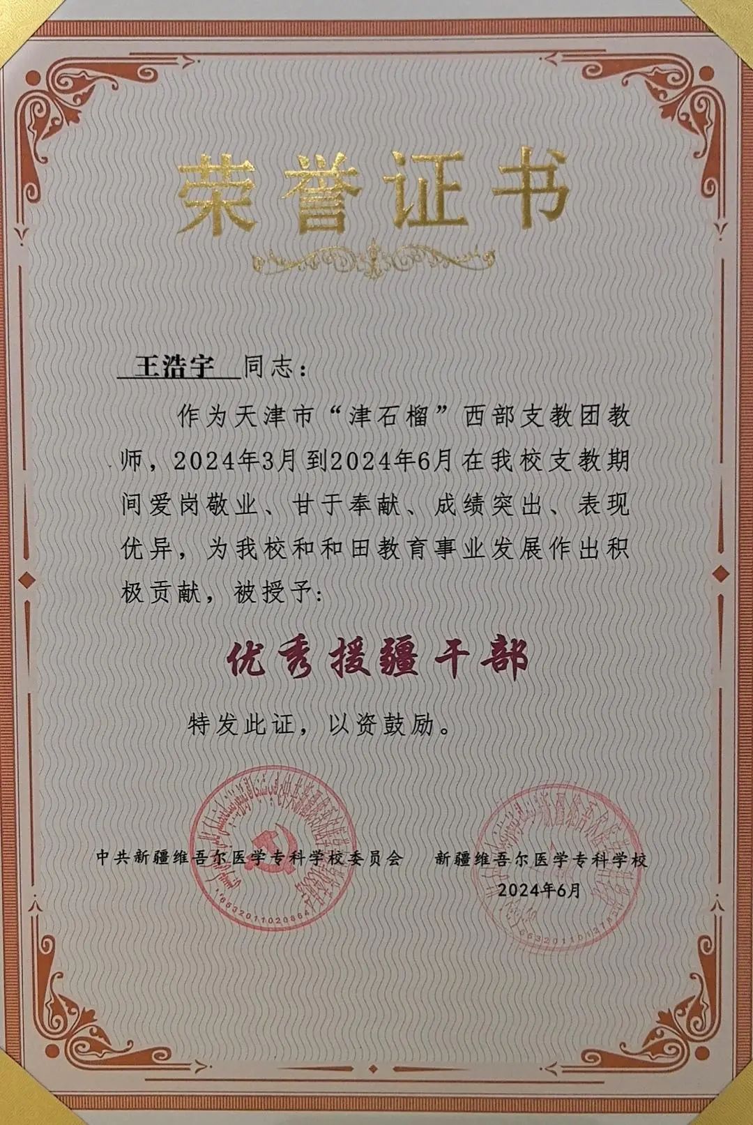 图7:“津石榴”支教团成员王浩宇荣获“优秀援疆干部”荣誉称号