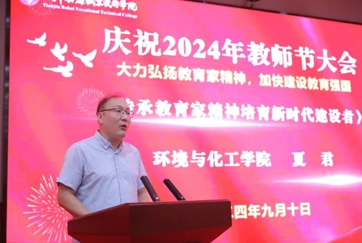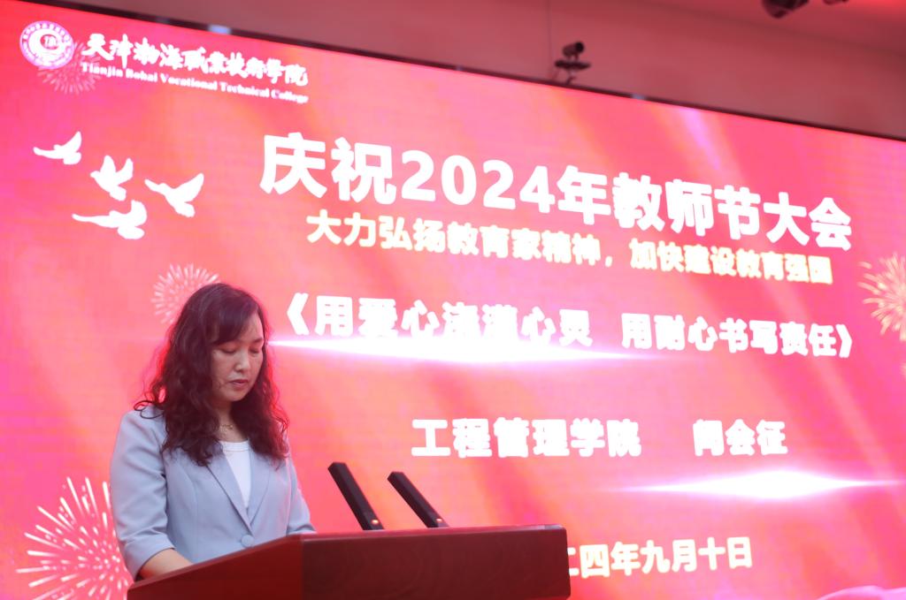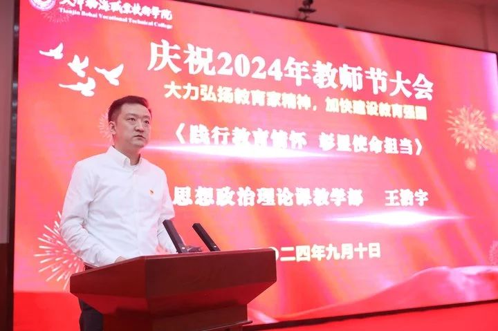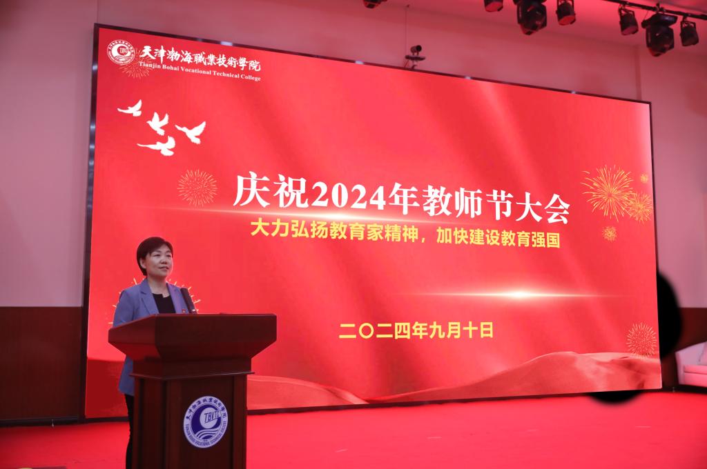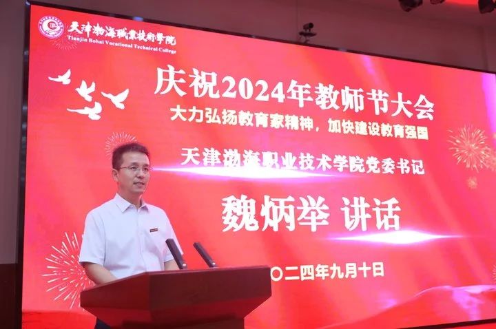 魏炳举代表学院党委向全体教职员工致以节日的问候,向天津市教育系统先进集体、天津市优秀教师、天津市优秀教育工作者、从教30年的老教师以及学生评选出的最喜爱的任课教师和最喜爱的辅导员表示热烈的祝贺!赞扬了几十年如一日,坚守在教学一线,默默奉献,生动诠释教育家精神的教师们。他指出:教育家精神是教育工作者的灵魂和旗帜。大力弘扬教育家精神,就是要坚守教育初心,牢记育人使命。要热爱教育事业,把教育当作一种信仰、一种追求,用心去关爱每一位学生,用爱去点燃每一个希望。最后他向全体教师提出四点希望,鼓励全体教职工以更加饱满的热情投入到职业教育事业中,为培养更多大国工匠不懈奋斗。