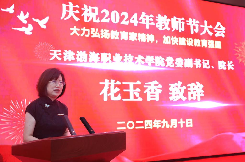 花玉香代表学院向在教育、科研、管理及服务一线默默耕耘、奉献担当、创新实干的广大教职员工和离退休老同志致以最崇高的敬意和最温馨的祝福,高度赞扬了教师们在教育教学、科研创新和社会服务等方面的卓越贡献,并向全体教师提出:要坚定践行教育家精神,做一名热爱教育事业的“追梦人”;要精彩传递职业教育理念,做一名培育有用人才的“大先生”;要坚持教学相长学习实践,做一名职业教育的“大专家”。