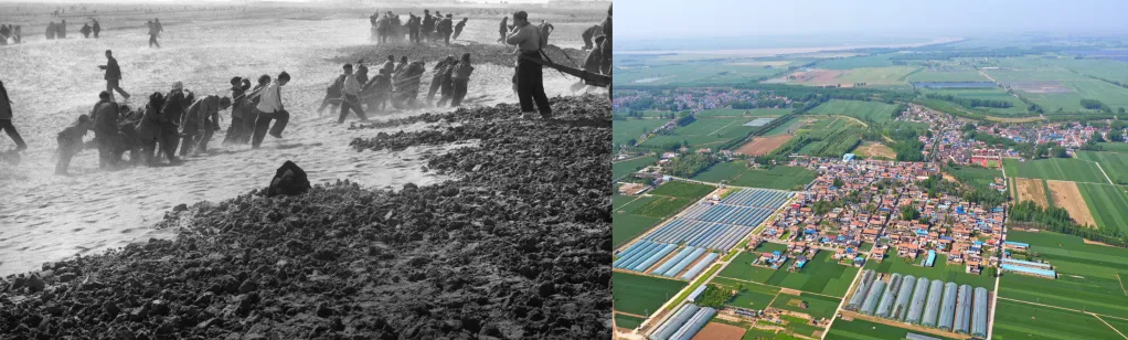 拼版照片:左图为兰考群众在拉淤土压沙(新华社记者 邓历耕 摄);右图为2024年4月25日拍摄的兰考县张庄村(无人机照片,新华社记者 郝源 摄)。