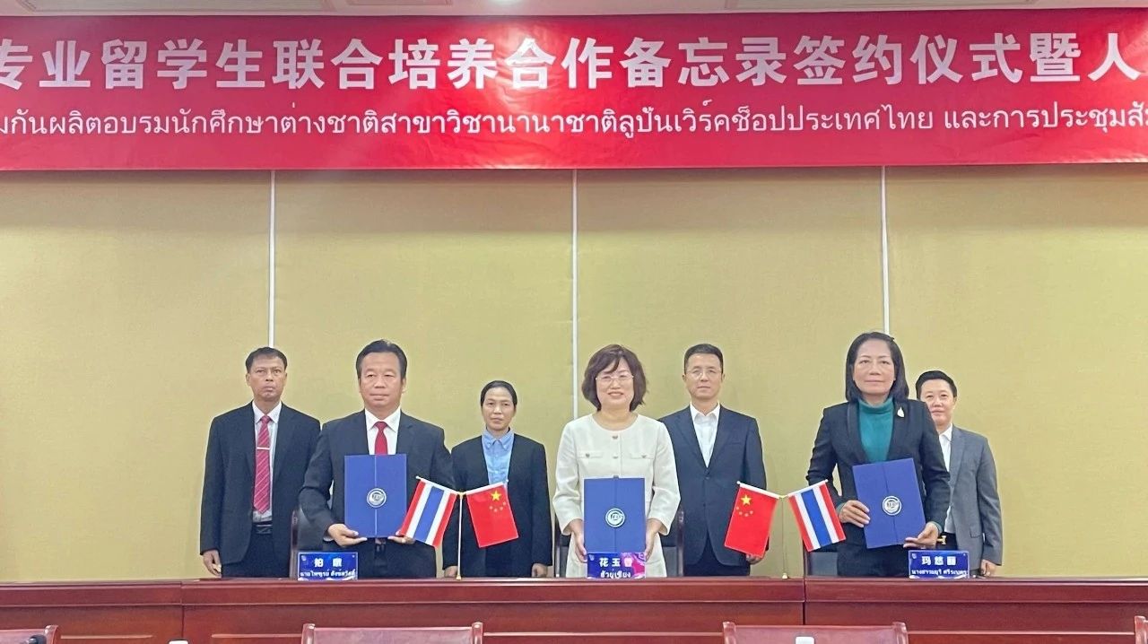 会上,花玉香、玛悠丽、拍暾共同签署泰国鲁班工坊国际专业留学生联合培养合作备忘录。按照备忘录,三方将充分整合各自优势资源,从合作招生、人才培养、师资培训等方面开展深入合作,共同推动泰国鲁班工坊蓬勃发展。
