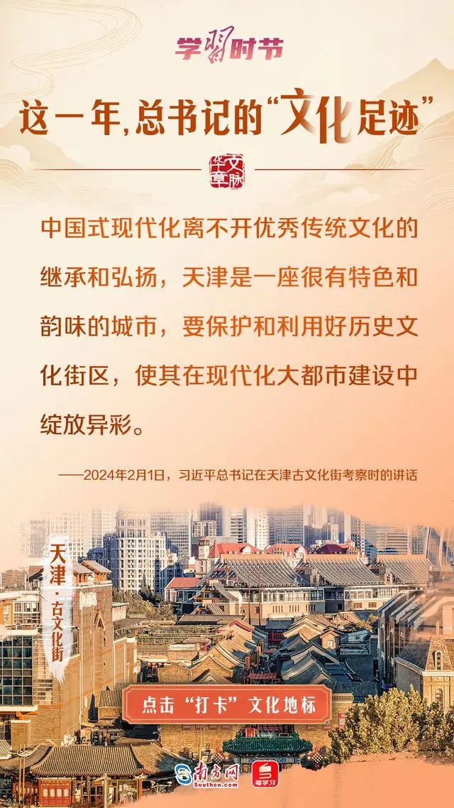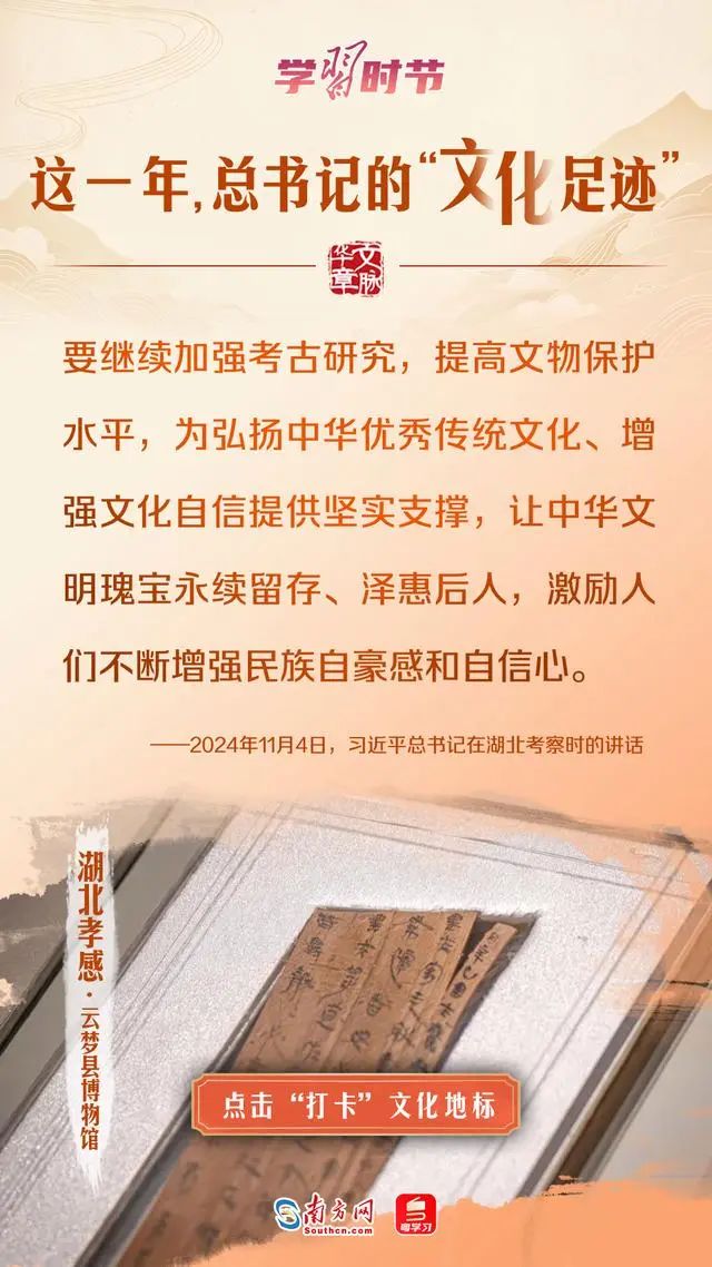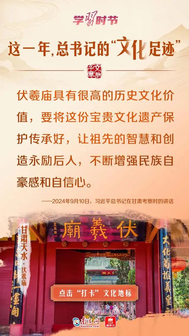 今年以来,习近平总书记曾参观考察天津古文化街、甘肃伏羲庙、湖北云梦县博物馆等文化地标,强调要让中华文明瑰宝永续留存、泽惠后人,激励人们不断增强民族自豪感和自信心。