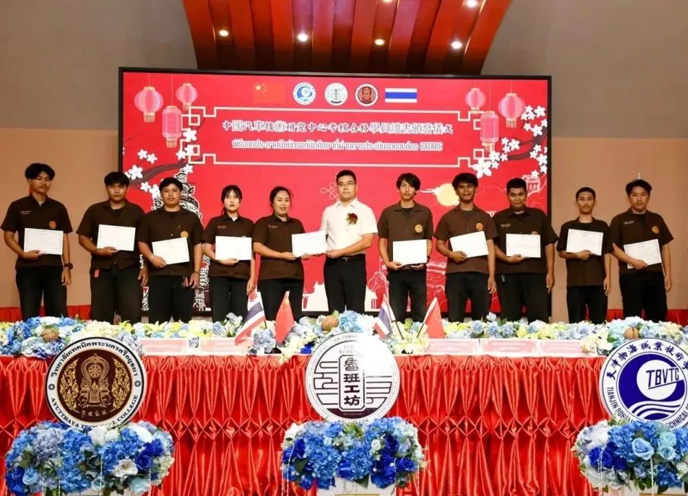 专业建设携手并进:天津渤海职业技术学院与泰国大城技术学院签署电气自动化技术国际专业合作建设备忘录,采用“0.5+2+0.5”的中泰联合培养模式,泰国学生需在天津渤海职业技术学院完成两年的专业学习、实训等教学活动并取得规定的课程学分。学生毕业时将同时获得天津渤海职业技术学院和泰国大城技术学院两所学院颁发的毕业证书。