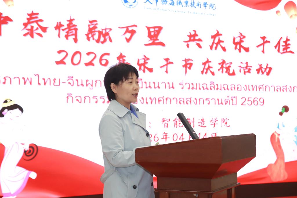 王蕾代表学院向全体泰国师生致以节日祝福。她指出,今年是泰国鲁班工坊建设十周年。十年来,中泰职教交流硕果累累,校园处处留下中泰学子共同成长的足迹。她表示,学院将始终秉持开放包容理念,搭建多元文化交流平台,希望同学们争做中泰文化交流使者,在渤海校园书写精彩人生华章。