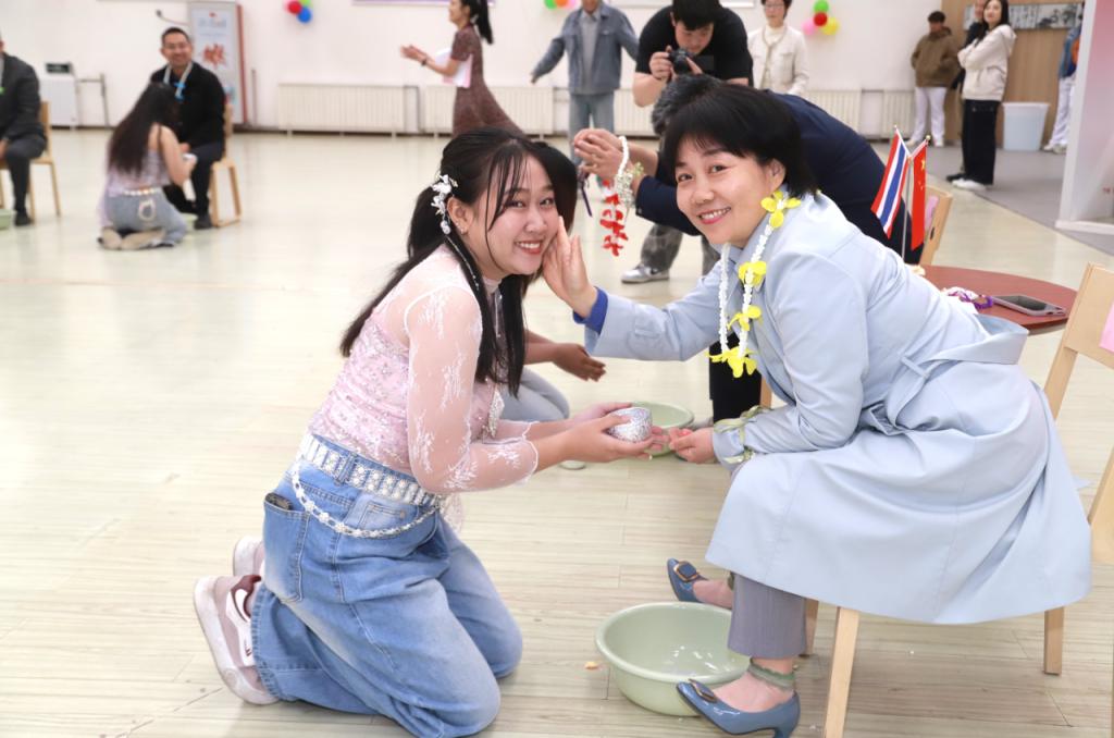 活动特别设置传统献水祝福环节。泰国留学生手捧花环与芳香净水,依次向老师们敬献祝福,表达感恩与敬意;老师们轻洒净水回赠祝愿,祈愿同学们身体健康、学业有成。