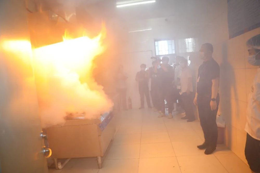 按照演练既定方案,各岗位工作人员迅速进入工作状态,模拟火灾的发生。膳食中心后厨工作人员在烹饪过程中,突发不可控制的火焰,喷淋设施自动响应,及时扑灭火种。后厨工作人员面对此种情况,及时上报,按照既定逃生路线,捂住口鼻弯腰前行,1分钟内撤离并在指定地点集合完毕。保卫处消防安全员在接到火灾警报后,第一时间身着防火服,手持灭火器赶赴现场,实地确认火种已被扑灭,无人员伤亡,有序进行后续事故调查和处置工作。