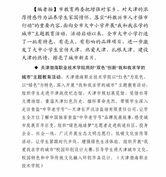 近日,学院“我和我求学的城市”主题特色活动开展情况被天津市学校思想政治工作委员会汇编的《学校思想政治工作情况》【2023年】第9期(总第9期)收录。原文如下: