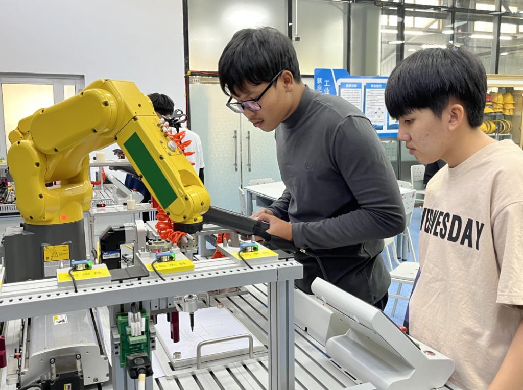 在机电工程学院,本学期留学生主要学习数控操作训练、工业机器人项目、传感器与检测等7门专业课程,留学生们对课程展现出了极高的学习热情和自律性。他们积极参与课堂讨论与实训操作,按时完成作业,并在课后与老师和同学进行深入的交流。