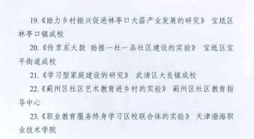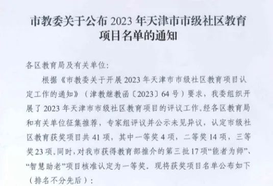 近日,学院申报的《职业教育服务终身学习“区校联合体”》项目经过专家评议,荣获2023年天津市市级社区教育项目三等奖。