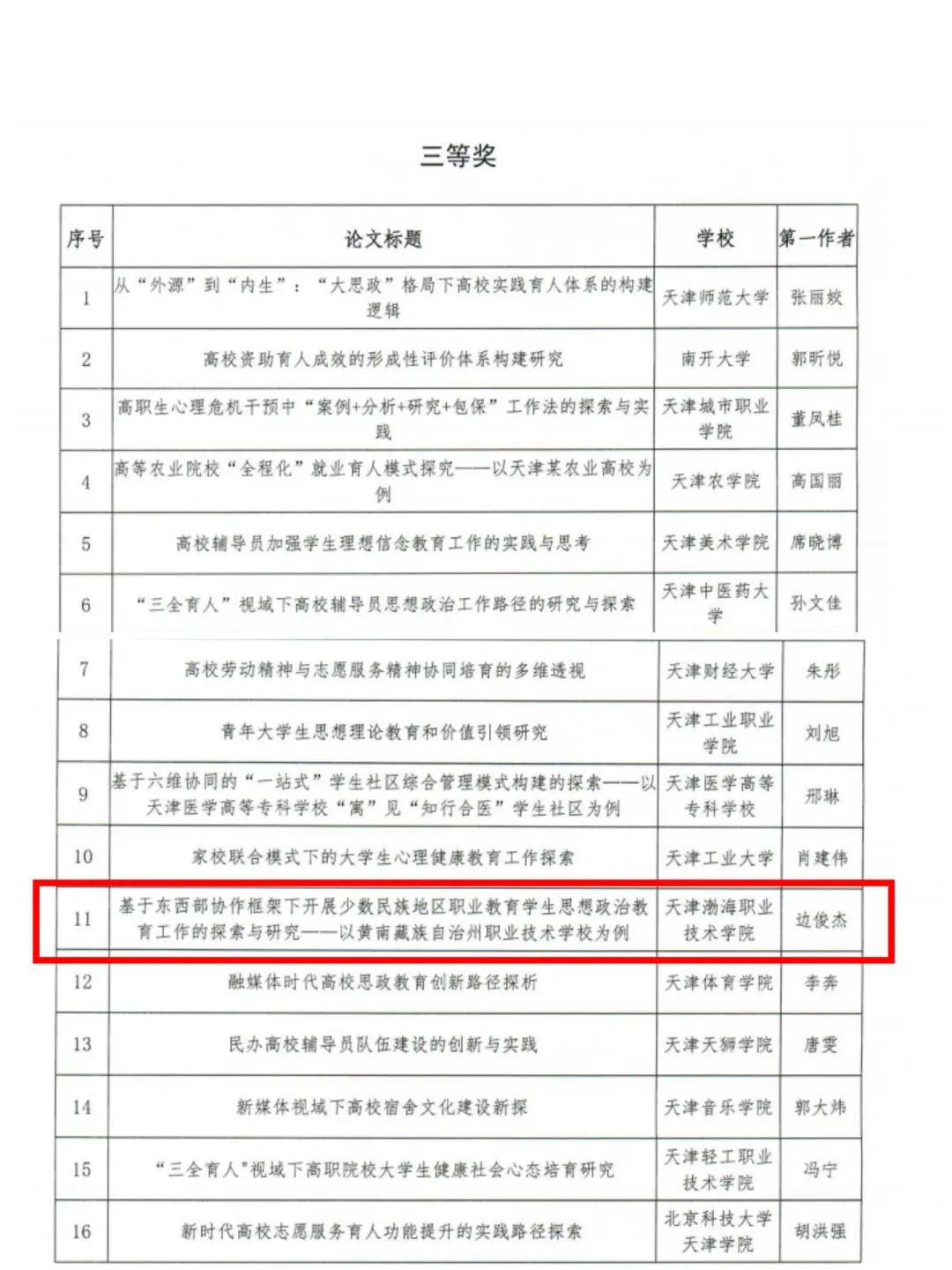 为深入学习贯彻习近平新时代中国特色社会主义思想和党的二十大精神,认真贯彻落实习近平总书记关于教育强国建设的重要要求,落实全国及我市高校思想政治工作会议部署,展示我市高校辅导员队伍在贯彻落实党的教育方针方面取得的新进展新实效,教育两委开展了2023年度天津市高校辅导员工作优秀论文征集活动。近日,评审结果揭晓,学院工商管理学院辅导员边俊杰荣获2023年度天津市高校辅导员工作优秀论文三等奖。