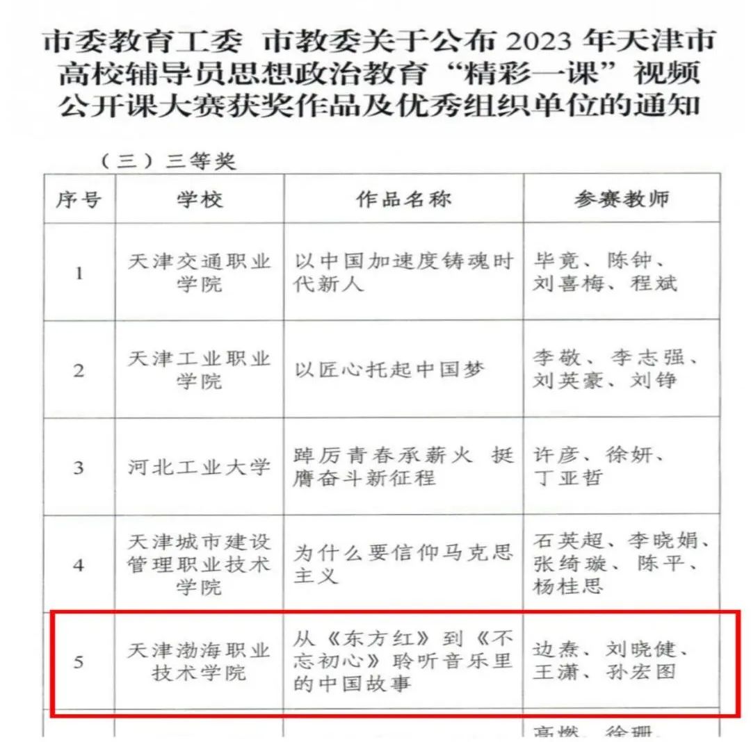 天津市高校辅导员思想政治教育“精彩一课”视频公开课大赛由市教育两委主办,面向全市高校辅导员开展,旨在深入学习贯彻习近平新时代中国特色社会主义思想,深化推进爱党爱国爱社会主义教育。学院历来高度重视、积极部署,组织辅导员广泛参与,近日,市教育两委公布了2023年天津市高校辅导员思想政治教育“精彩一课”视频公开课大赛评审结果,党委学生工作部边焘团队作品《从<东方红>到<不忘初心> 聆听音乐里的中国故事》荣获三等奖。