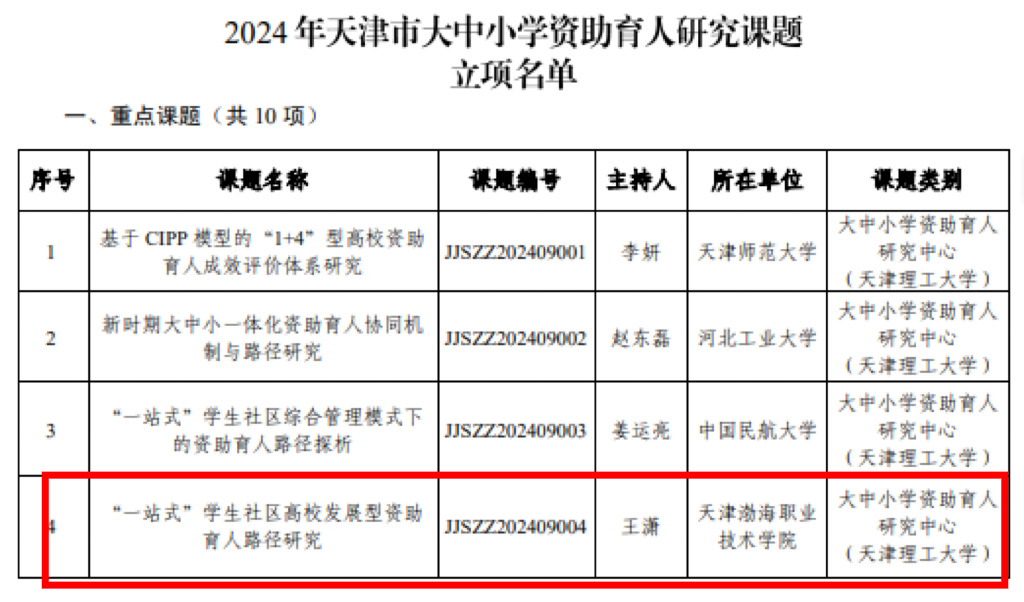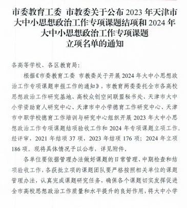 近日,市教育两委公布了2024年大中小思想政治工作专项课题立项结果,学院王潇课题组《“一站式”学生社区高校发展型资助育人路径研究》获批资助育人研究课题重点课题。