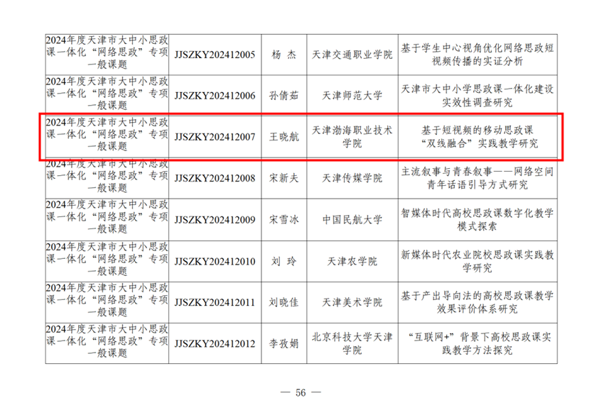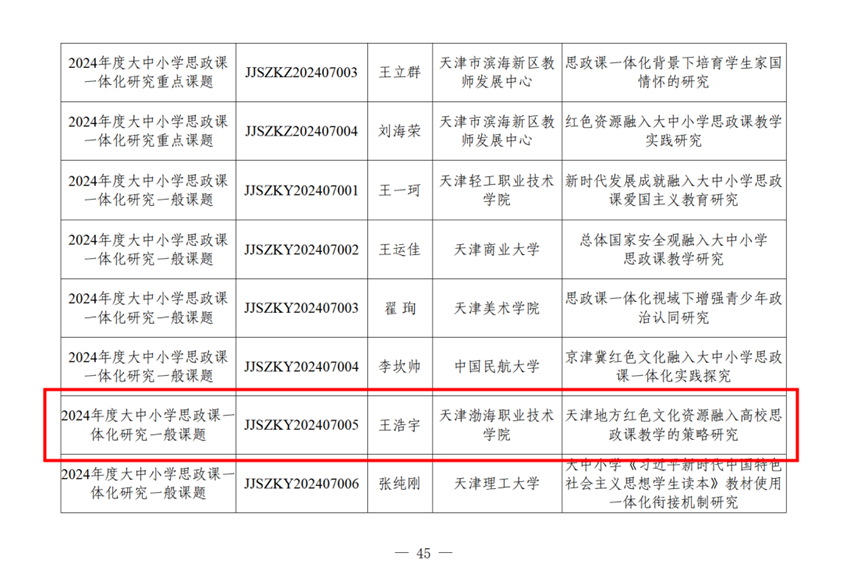 近日,市教育两委公布了2024年天津市思想政治理论课常设课题立项名单。学院思政教学部教师王晓航申报的《基于短视频的移动思政课“双线融合”实践教学研究》获批大中小学思政课一体化“网络思政”专项课题立项,王浩宇申报的《天津地方红色文化资源融入高校思政课教学的策略研究》获批大中小学思政课一体化研究课题立项。