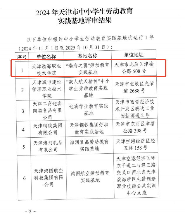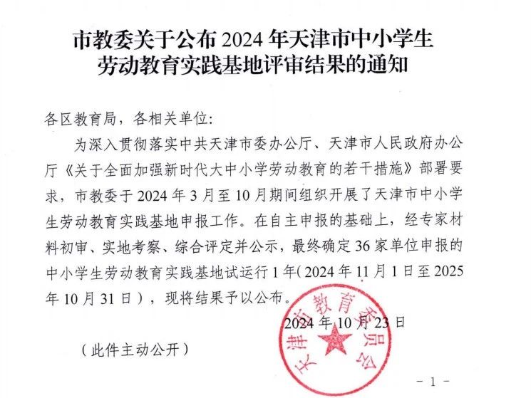 天津市教委于2024年10月23日公布了本年度天津市中小学生劳动教育实践基地的评审结果。在此次评选中,学院凭借卓越的教育培训模式和显著的教育成效,顺利通过2024年天津市中小学生劳动教育实践基地评审,该基地将试运行一年(2024年11月1日至2025年10月31日)。