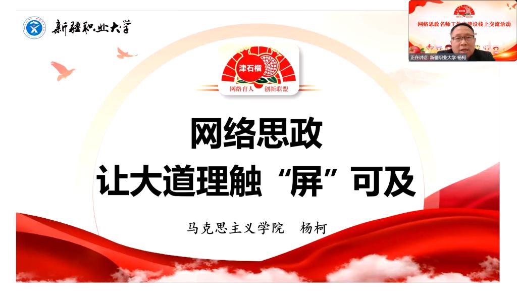为进一步推动“津石榴”网络育人创新联盟建设,形成育人合力,提升教师网络育人能力,铸牢中华民族共同体意识,11月8日下午,学院开展了“津石榴”网络育人创新联盟网络思政名师工作室建设线上培训交流活动。党委副书记、工会主席、副院长王蕾主持会议,和田职业技术学院、天津交通职业技术学院、乌鲁木齐职业大学、新疆轻工职业技术学院、天津医学高等专科学校、天津现代职业技术学院、喀什职业技术学院、新疆职业大学、天津市红星职业中等专业学校、天津市化学工业学校、奇台中等职业技术学院等联盟单位相关领导、思政教师、网络思政名师工作室成员等100余人线上参会,联盟专家委员会专家、新疆职业大学马克思主义学院院长杨柯教授线上出席会议,学院市级、校级网络思政名师工作室主要成员参会。