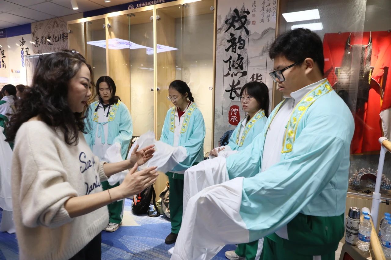 京剧元宇宙课程,为同学们开启了近距离领略国粹魅力的大门。在学院京剧基地,通过对京剧历史渊源的深入探究,同学们仿佛穿越了时空的长河,见证了京剧在岁月流转中如何从徽剧、汉调等多种戏曲形式融合发展而来,逐步成为中国传统艺术的瑰宝,深刻理解了其不可替代的艺术价值。而 VR 元宇宙观影环节更是别出心裁,借助先进的虚拟现实技术,学生们仿佛瞬间穿越时空隧道,置身于不同的历史场景之中,近距离体验那些或波澜壮阔或感人至深的文化故事,让历史不再是书本上的文字记载,而是鲜活生动地呈现在眼前,进一步加深了他们对传统文化的认知与感悟,同时体验了中国传统戏曲文化“转手绢”基本功。