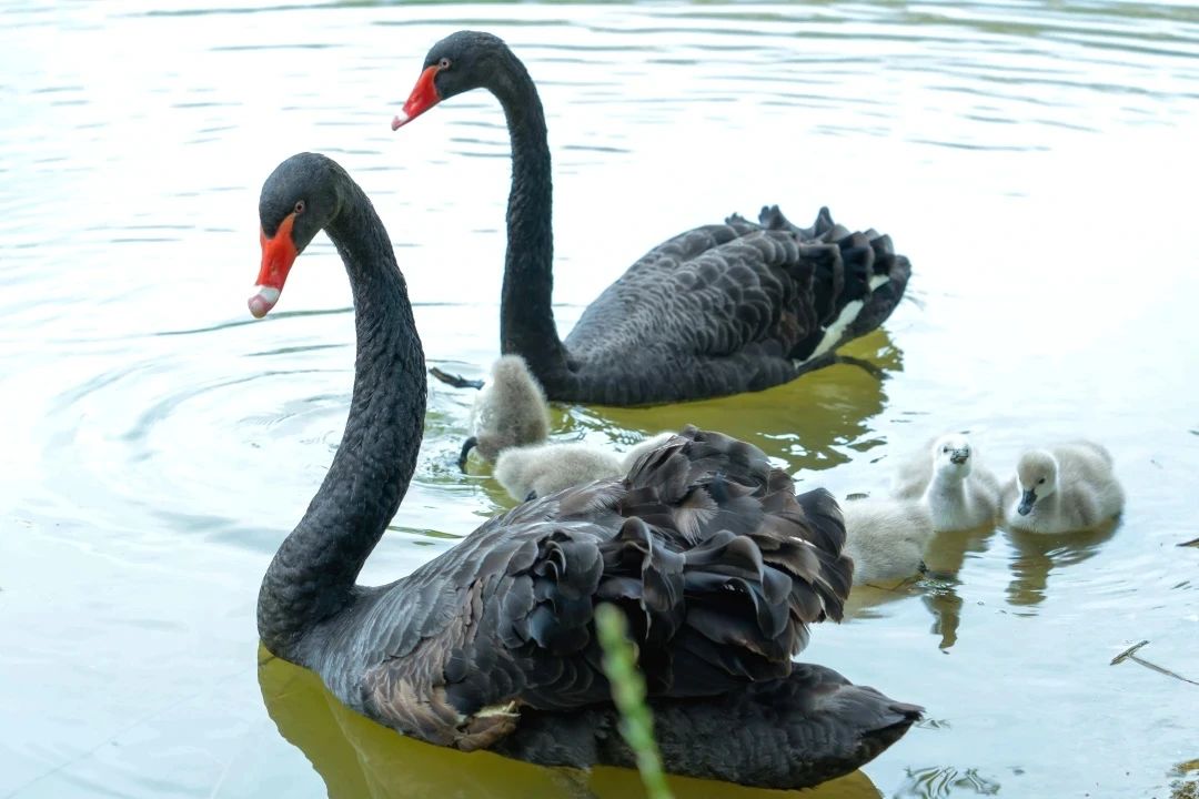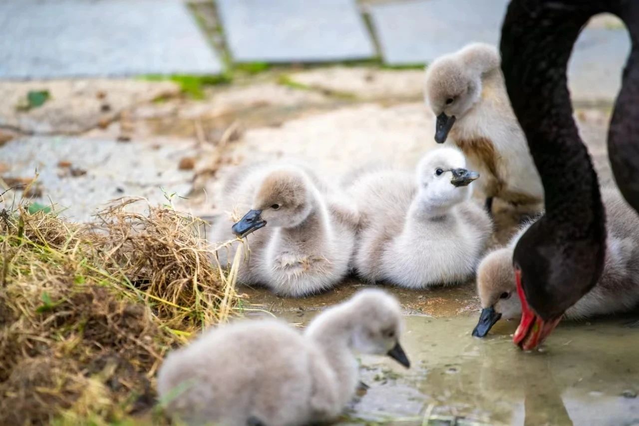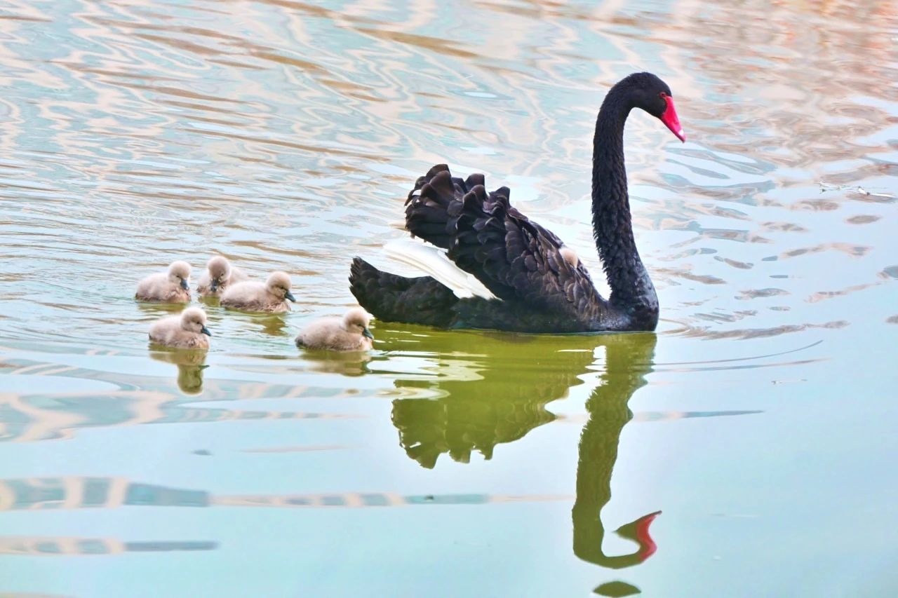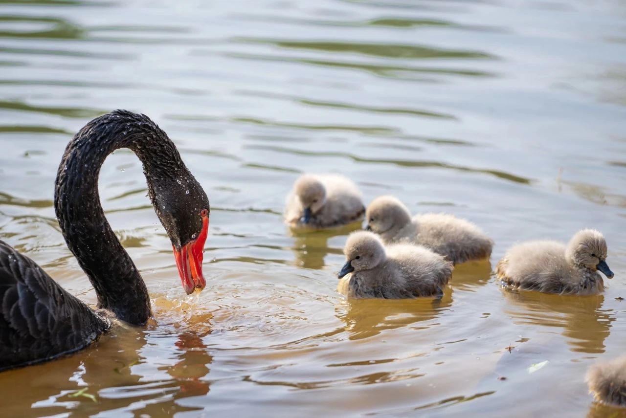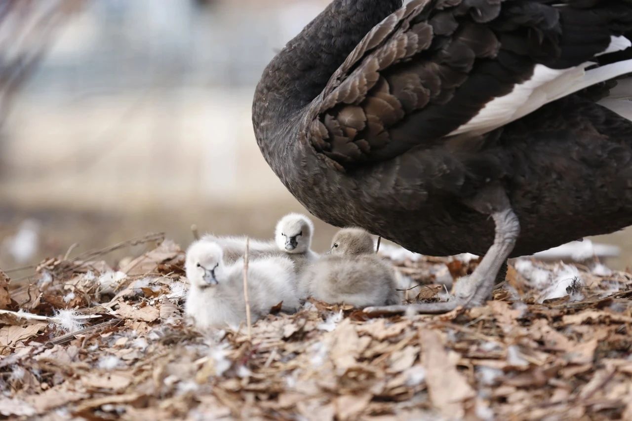 黑天鹅宝宝披着灰色的绒毛,探着小小的脑袋,在鹅爸爸鹅妈妈的陪伴下,好奇地打量着世界。偶尔,寒风吹来,黑天鹅宝宝还会钻进爸爸妈妈的羽翼下寻求温暖,那乖巧可人、憨态可掬的模样,让人爱不释手。