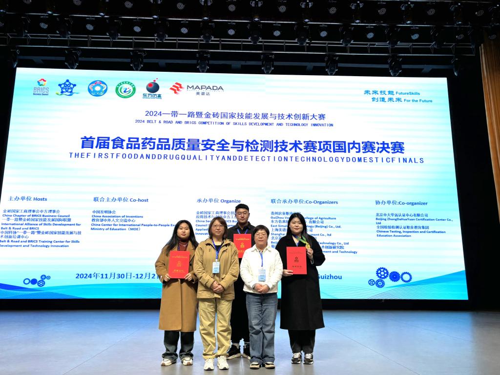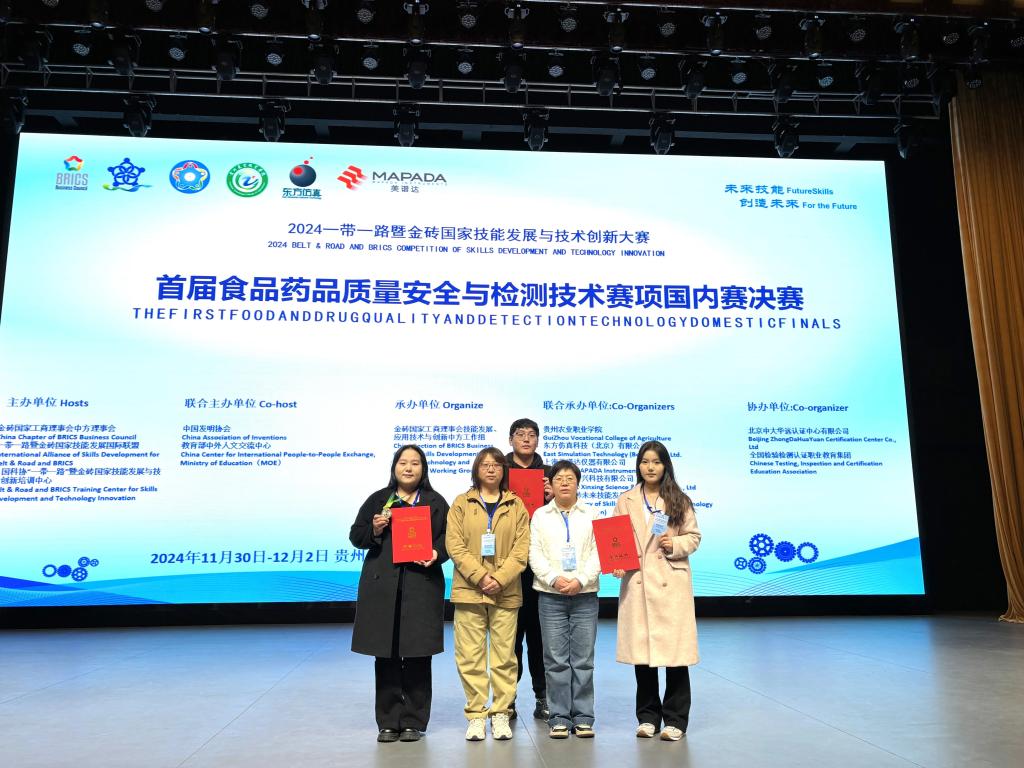11月29日至12月3日,“2024一带一路暨金砖国家技能发展与技术创新大赛之首届食品药品质量安全与检测技术赛项”国内赛决赛在贵州农业职业学院举行,共有来自全国本科、高职、中职院校的88支队伍参加。经过激烈角逐,学院选派的两支代表队中,由药品233班郑钰淳、环工231班孙雪薇、食安231班吴俊达组成的第1代表队以全国第2名的成绩摘得金奖,由食安232班袁子怡、药品233班闫思彤、食安231班马光宇组成的第2代表队摘得银奖,学院教师赵靖、伍丽娜获评优秀指导教师称号。