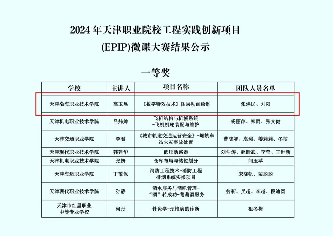 12月2日,由天津中华职业教育社举办的2024年天津职业院校工程实践创新项目微课大赛决赛隆重举行,本次大赛共有12所高职院校、3所中职院校参加,共征集微课作品140余个。经过大赛的网络评审以及现场评审,通过无学生现场教学展示和介绍教学实施设计方案等决赛环节,学院教师高玉昱、张洪民和刘阳组成的团队荣获一等奖。