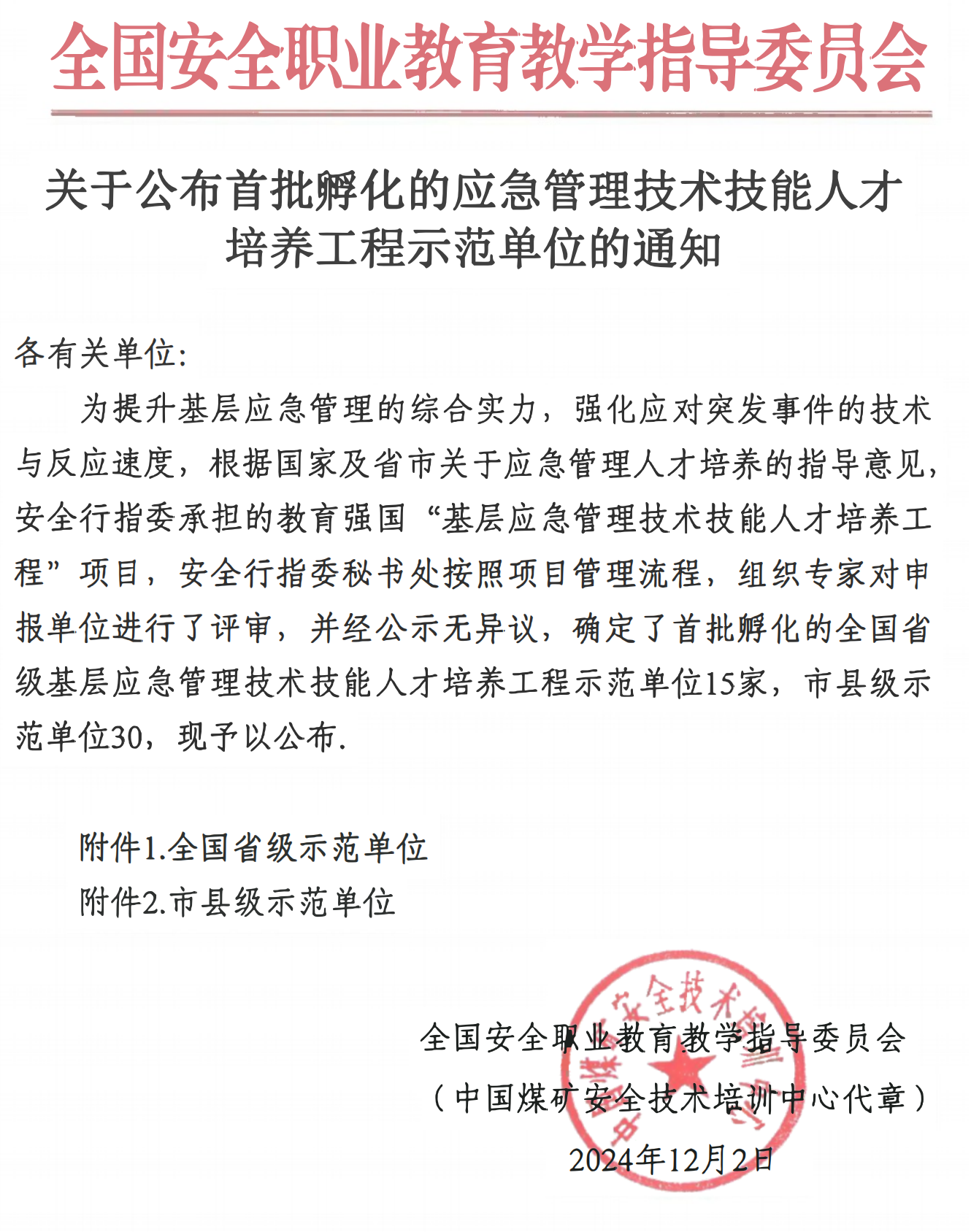 12月2日,全国安全职业教育教学指导委员会公布首批拟孵化的应急管理技术人才培养工程示范单位名单,确定了首批拟孵化的全国省级基层应急管理技术技能人才培养工程示范单位15家,市县级示范单位30家。学院获评首批拟孵化的“全国省级基层应急管理技术技能人才培养工程示范单位”。