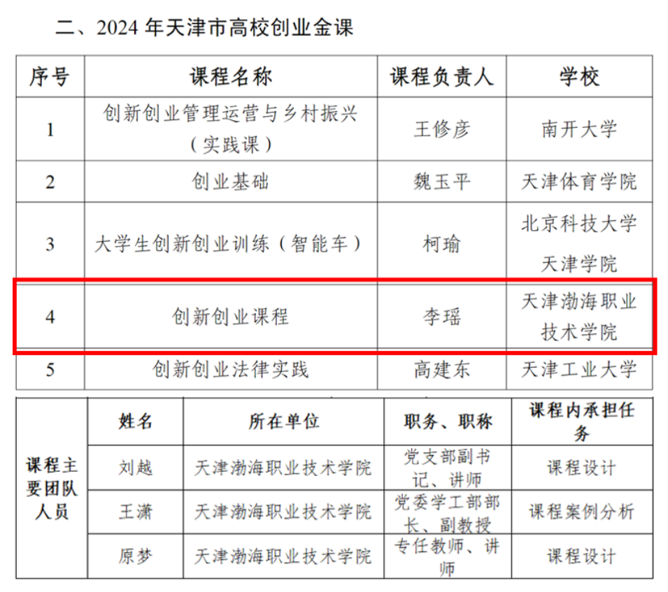近日,天津市教育委员会发布了《关于公布天津市高校就业创业金课入选名单的通知》。学校《创新创业课程》在天津市各高校的百门课程中脱颖而出,被评为2024年天津市高校就业创业金课,是此次获评中唯一的高职院校,充分彰显了学校在生涯教育与创业指导工作方面的成效与深厚底蕴。