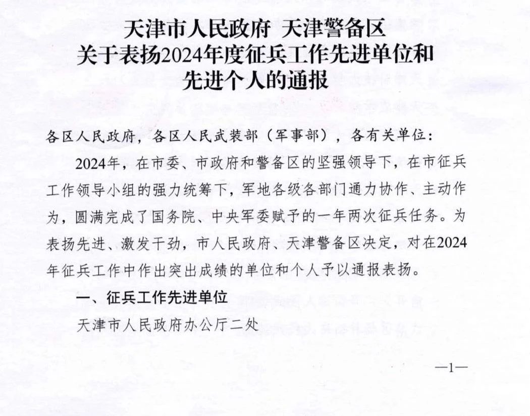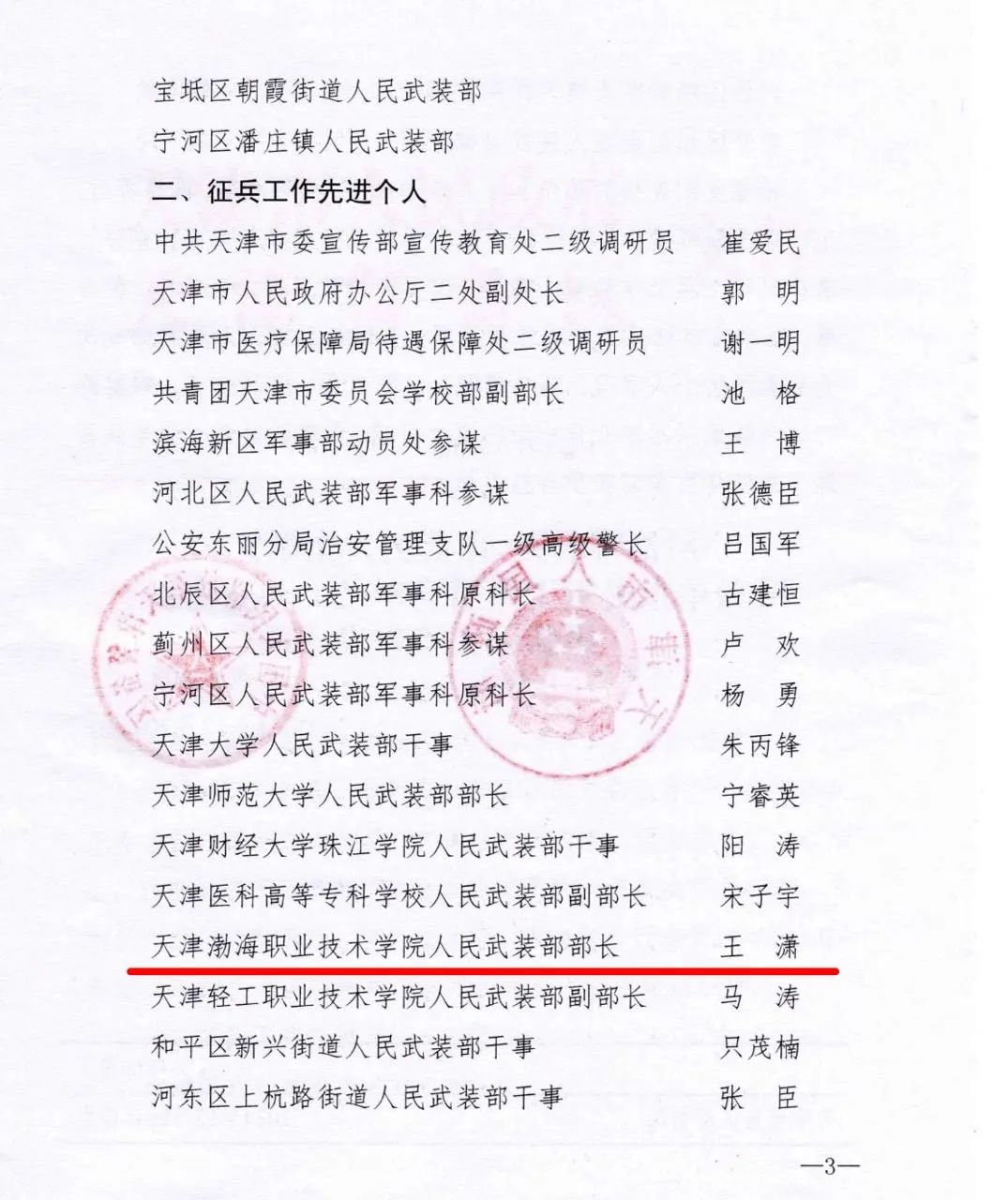 12月27日,2025年天津市征兵工作会议隆重举行,天津市人民政府、天津警备区通报表扬2024年度征兵工作先进单位和先进个人,学校武装部主任王潇获评天津市2024年度“征兵工作先进个人”荣誉称号。