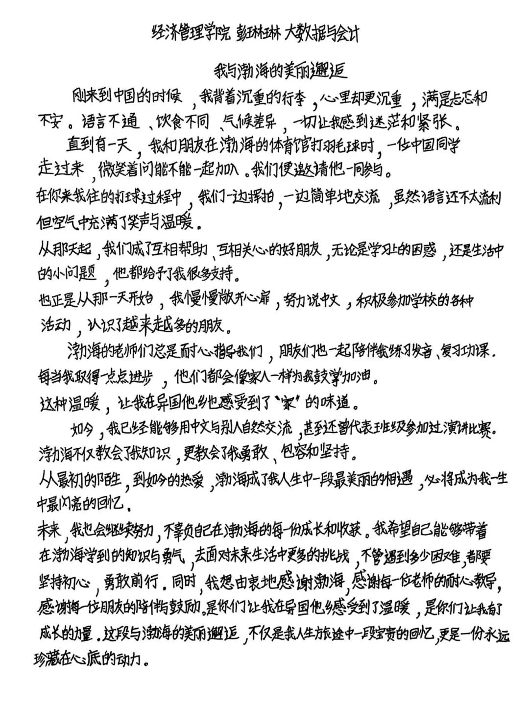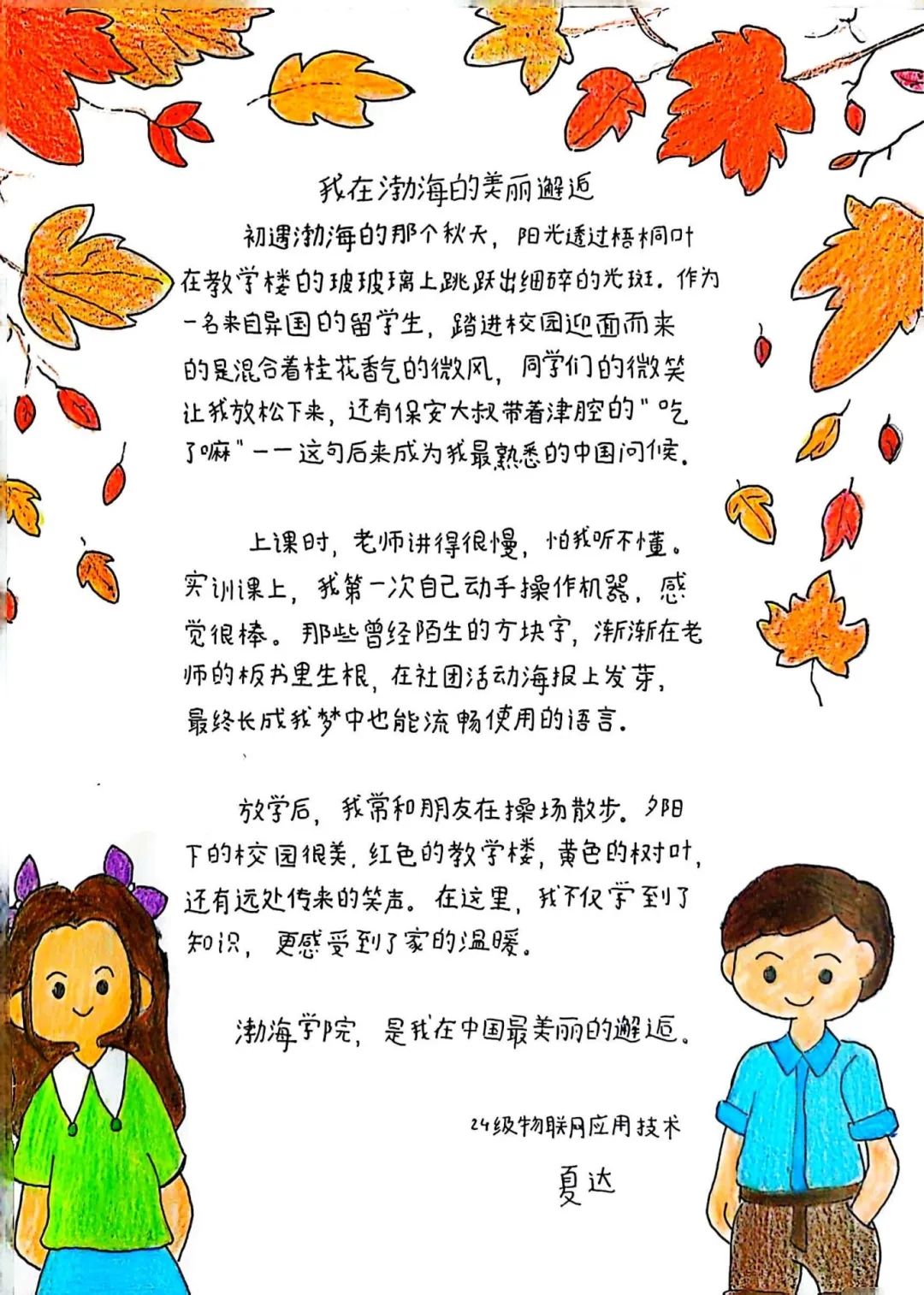 征文聚焦留学生从“文化初遇”到“深度融入”的蜕变历程。信息工程学院留学生夏达在《我在渤海的美丽邂逅》中,细腻描绘了课堂上师生互动的温暖场景;经济管理学院恒月的《浪花里的汉语课》则以幽默笔触讲述了中文学习中的趣事,字里行间洋溢着对中国文化的热爱。众多参赛作品中,既有对渤海校园风光的诗意描摹,也有对传统节日、市井生活的鲜活记录,展现了中外文化碰撞的独特魅力。