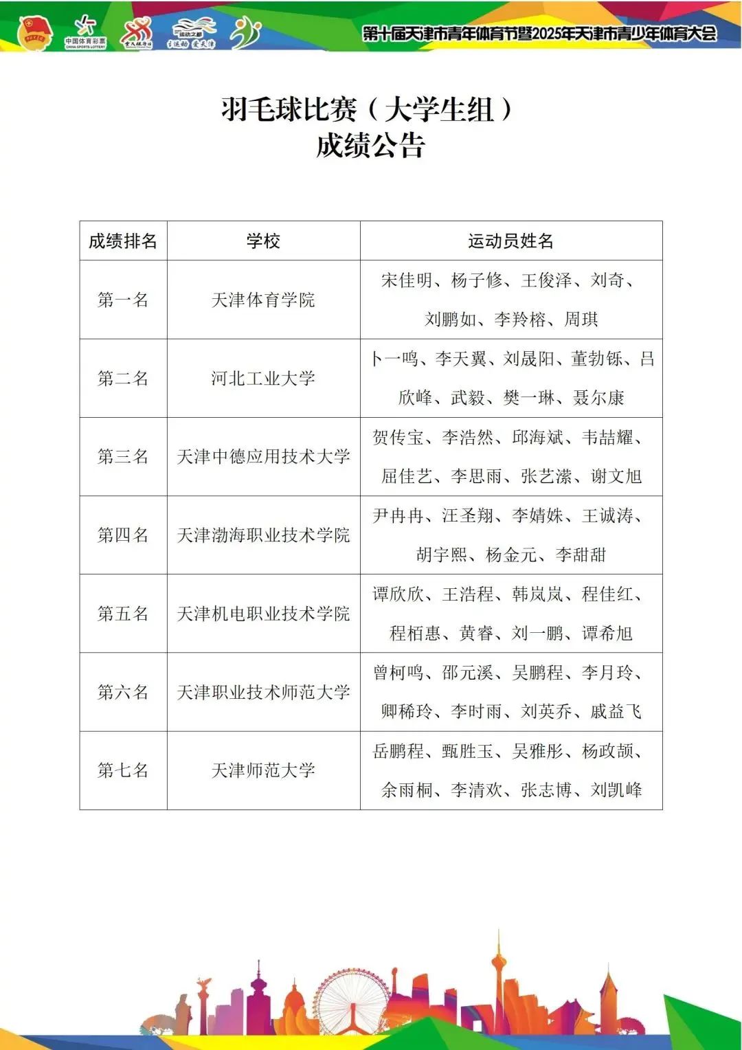 6月23日至24日,第十届天津市青年体育节暨2025年天津市青少年体育大会羽毛球比赛在天津市飞子体育运动中心圆满落幕。本次赛事吸引了来自全市各系统的240余名青年运动员参赛。经过激烈角逐,学院羽毛球队作为唯一闯入四强的高职院校代表队,最终荣获大学生混合团体赛第四名。