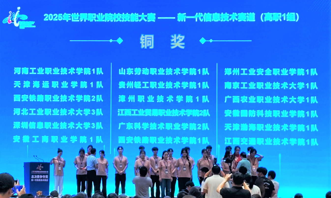 近日,2025年世界职业院校技能大赛争夺赛新一代信息技术赛道(高职组)在江苏常州落幕。我院人工智能学院团队从全国208支顶尖高职队伍中突围,斩获铜奖,彰显学院在该领域的人才培养实力。