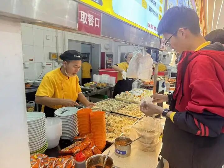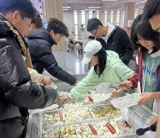 走进食堂,热气腾腾的景象扑面而来。餐台上,一盘盘饱满圆润的饺子整齐码放,宛如元宝,寄托着冬日的富足与安康。除了传统的白色水饺,食堂还匠心独运,推出了用南瓜汁、蔬菜汁等调色的彩色饺子,金黄、翠绿、紫莹,色彩缤纷,不仅满足了味蕾,更带来了视觉上的享受。饺子馅料种类繁多,每个盛放饺子的区域前都设有醒目的红色标签,清晰标注着对应口味,供师生按喜好自由选择。