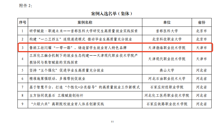 近日,高校毕业生就业协会发布《关于公布2025届毕业生就业创业工作典型案例入选名单的通知》,学院申报的《鲁班工坊闪耀“一带一路”,铸造留学生就业育人特色品牌》案例成功入选集体典型案例名单。