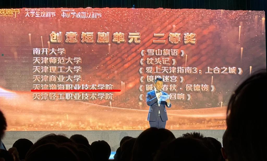 1月8日,天津银行·2025天津戏剧节暨第三届天津大学生戏剧节闭幕式在南开中学百年瑞廷礼堂隆重举行。我院党委副书记、工会主席、副院长王蕾带领教师和学生代表参加了闭幕式。在荣誉展示环节,现场大屏幕揭晓获奖名单,我院选送的原创京剧《碱业春秋·侯德榜》荣获创意短剧单元二等奖。这是继去年我院作品获奖后,再次在该项赛事中取得佳绩,展现了我院在校园戏剧创作与文化育人方面的持续活力。