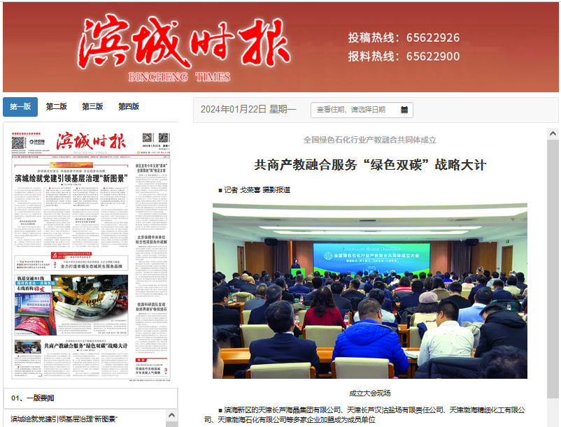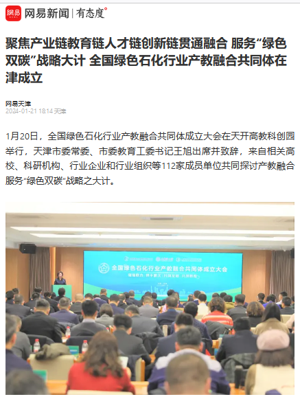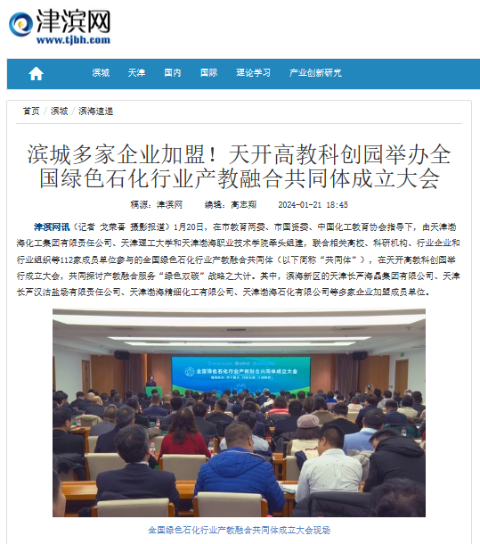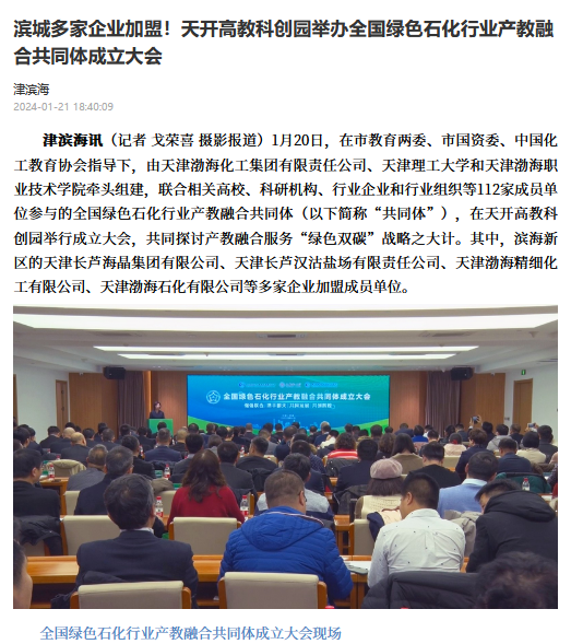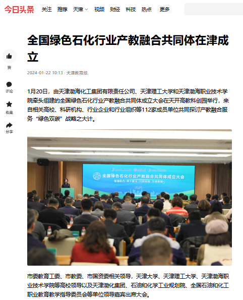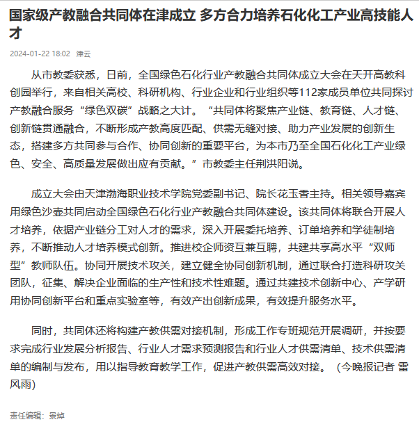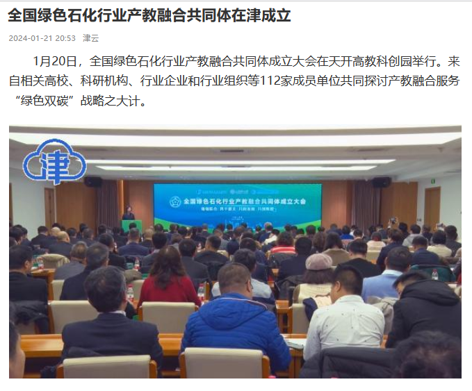1月20日,由天津渤海化工集团有限责任公司、天津理工大学和天津渤海职业技术学院牵头组建的全国绿色石化行业产教融合共同体成立大会在天开高教科创园举行,来自相关高校、科研机构、行业企业和行业组织等112家成员单位共同探讨产教融合服务“绿色双碳”战略之大计。本次活动得到媒体广泛关注,新华社等多家媒体进行报道。
