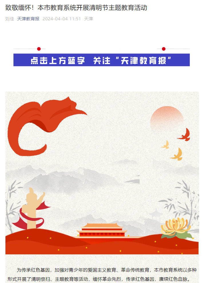 4月4日,《天津教育报》报道学院组织学生骨干前往天津市宁河区于方舟烈士故居开展了“清明祭英烈 厚植爱国情”缅怀于方舟烈士主题教育活动。