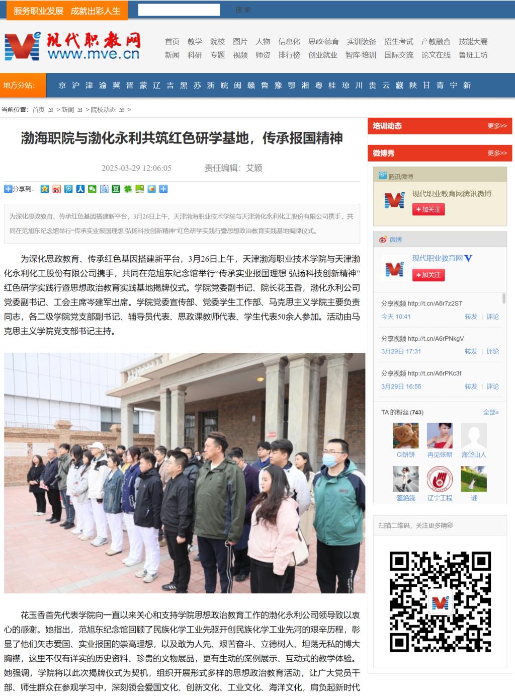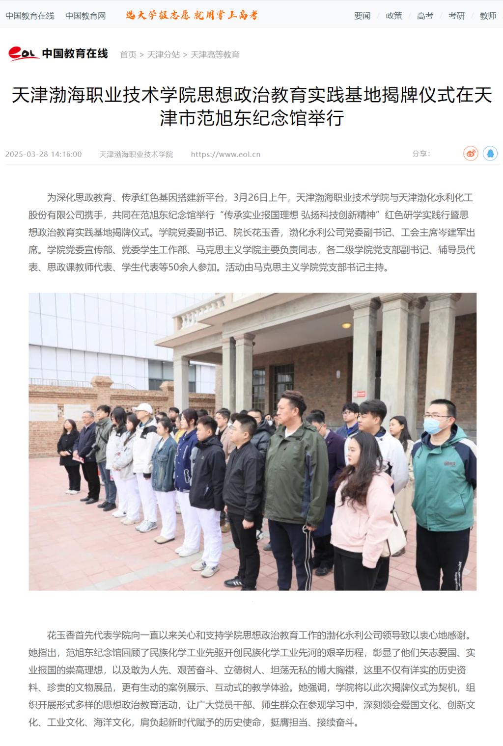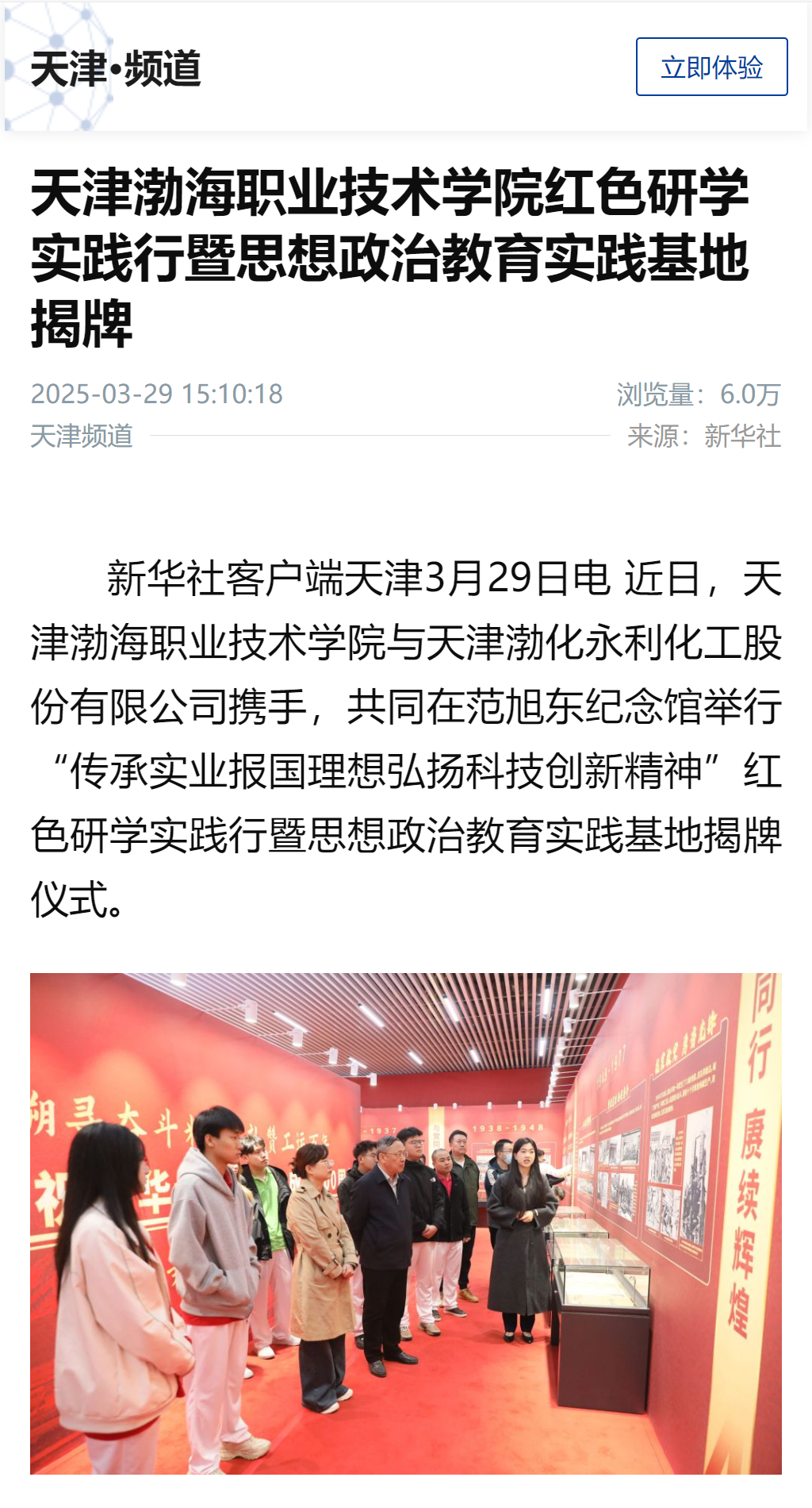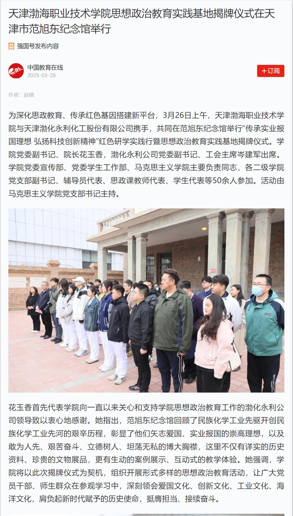 近日,学院与天津渤化永利化工股份有限公司在范旭东纪念馆举行的"传承实业报国理想 弘扬科技创新精神"红色研学实践行暨思想政治教育实践基地揭牌仪式,获得新华社、学习强国、中国教育在线、现代职教网等权威媒体的聚焦报道。