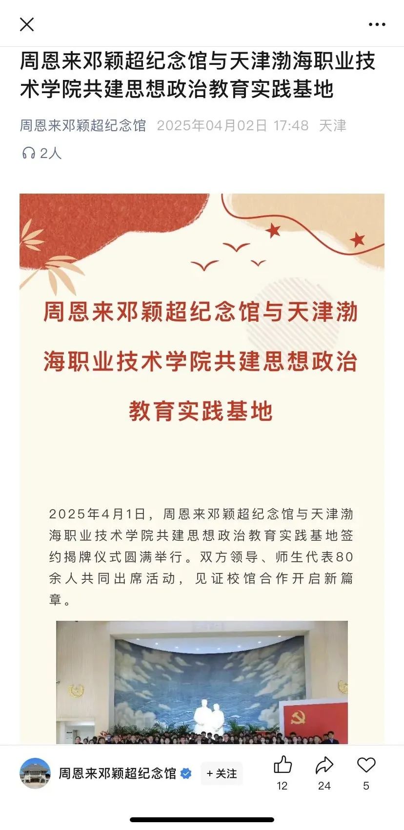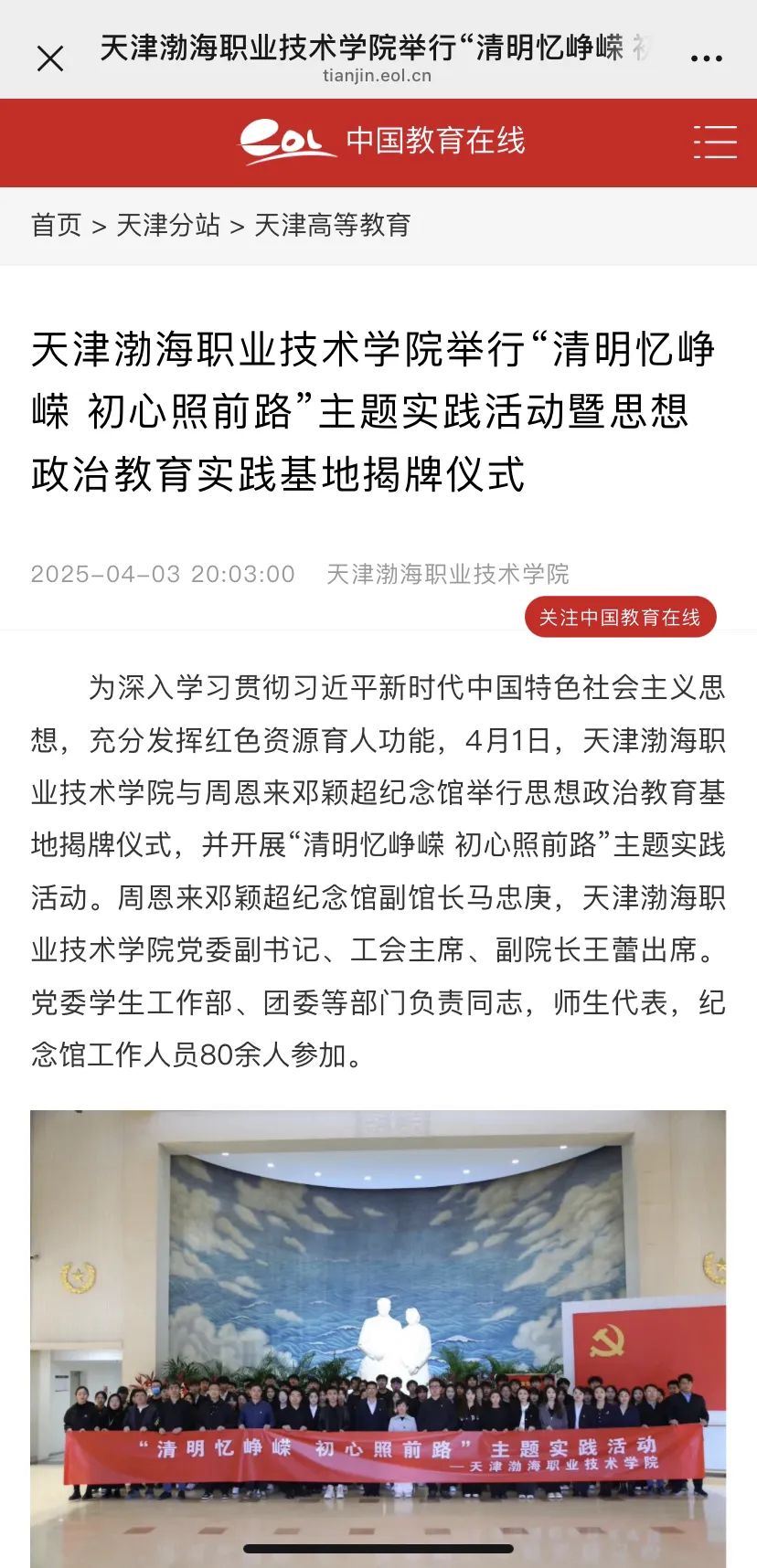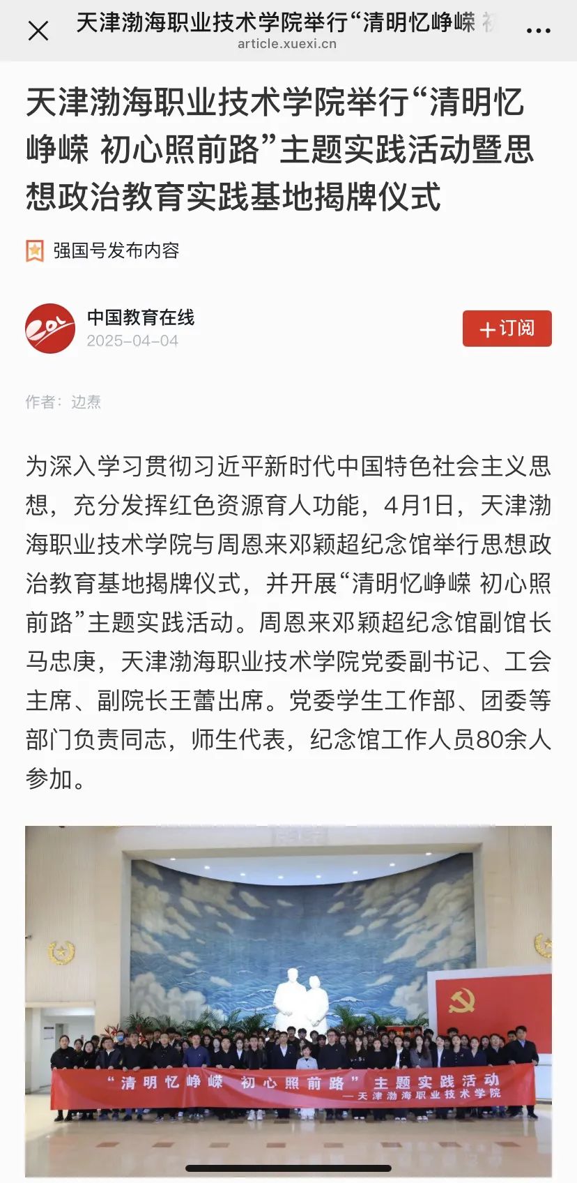 近日,学院与周恩来邓颖超纪念馆举行思想政治教育实践基地揭牌仪式,并开展“清明忆峥嵘 初心照前路”主题实践活动,获得学习强国、中国教育在线、现代职教网、周恩来邓颖超纪念馆公众号等媒体的聚焦报道。