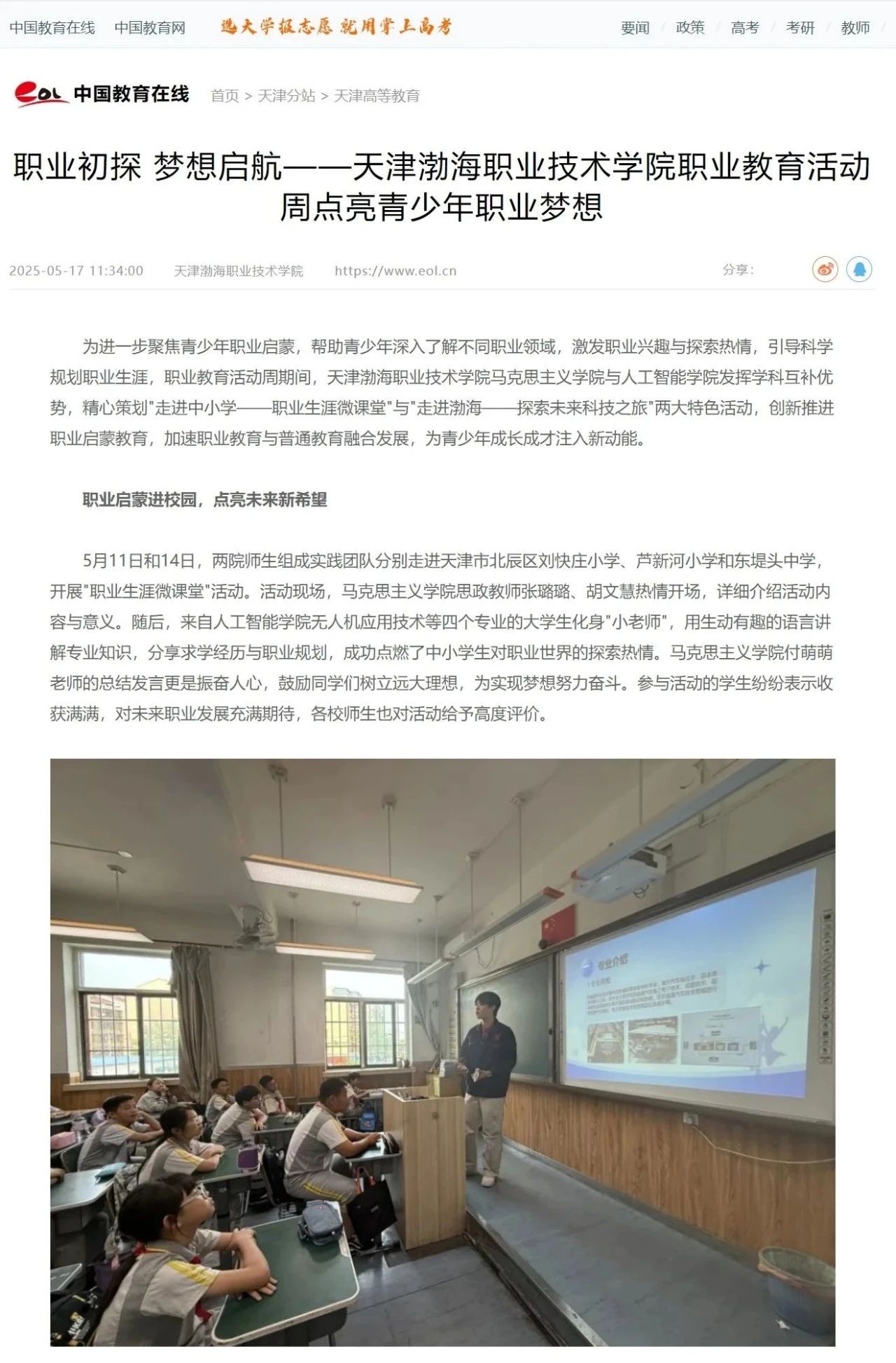 为进一步聚焦青少年职业启蒙,帮助青少年深入了解不同职业领域,激发职业兴趣与探索热情,引导科学规划职业生涯,职业教育活动周期间,学院马克思主义学院与人工智能学院发挥学科互补优势,精心策划“走进中小学——职业生涯微课堂“与“走进渤海——探索未来科技之旅”两大特色活动,获学习强国、中国教育在线等媒体聚焦报道。